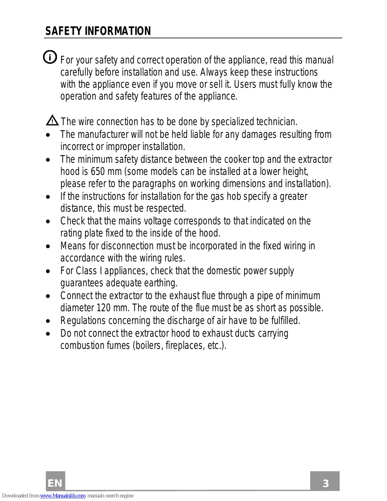 The wire connection has to be done by specialized technician. The manufacturer will not be held liable for any damages resulting from incorrect or improper installation. The minimum safety distance between the cooker top and the extractor hood is 650 mm (some models can be installed at a lower height, please refer to the paragraphs on working dimensions and installation). If the instructions for installation for the gas hob specify a greater distance, this must be respected. Check that the mains voltage corresponds to that indicated on the rating plate fixed to the inside of the hood. Means for disconnection must be incorporated in the fixed wiring in accordance with the wiring rules. For Class I appliances, check that the domestic power supply guarantees adequate earthing. Connect the extractor to the exhaust flue through a pipe of minimum diameter 120 mm. The route of the flue must be as short as possible. Regulations concerning the discharge of air have to be fulfilled. Do not connect the extractor hood to exhaust ducts carrying combustion fumes (boilers, fireplaces, etc.).