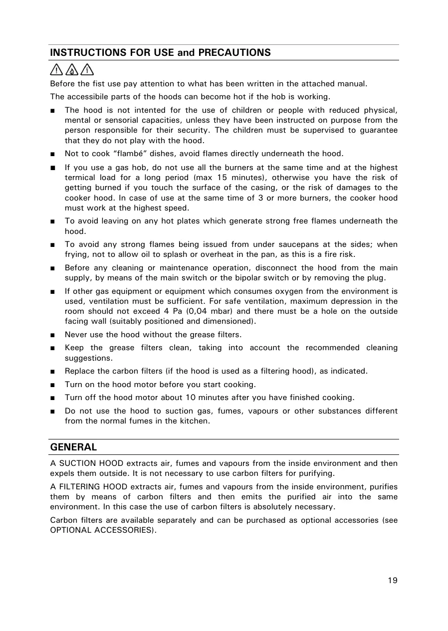 It is absolutely forbidden for the user to connect the air discharge of the hood, when used a suction hood, to boiler chimneys, gas, fume or vapour scavenging chimneys or any other duct, even only ventilation ducts, which have been used or will be used for other devices. Moreover it is not permitted to connect the scavenging pipe for fumes in other adjacent rooms or wellholes, or pipes for fire-fighting devices. In any case it is necessary to respect all norms concerning scavenging of the air. Any user who does not adhere to these instructions is risking his own life and the lives of others. In this case, the manufacturer declines any responsibility.