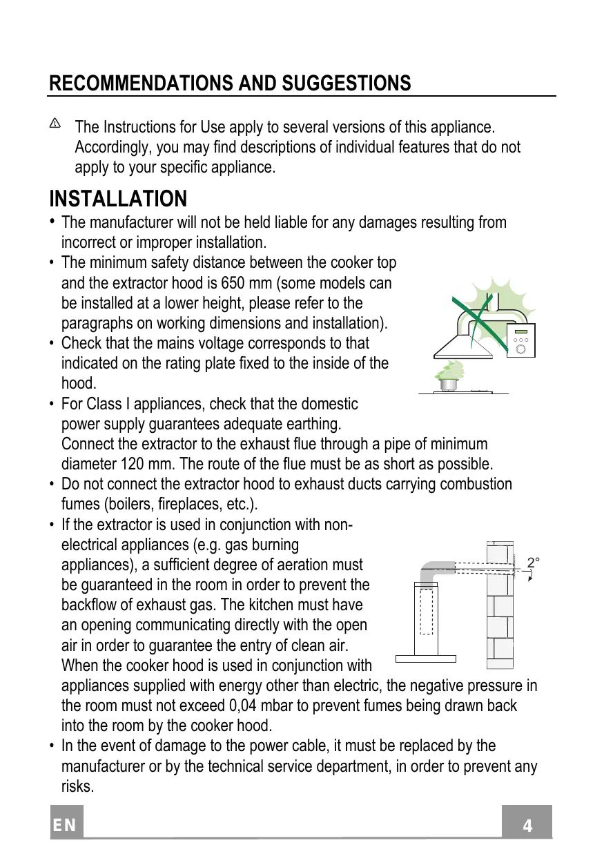 • La distance de sécurité minimum entre le plan de cuisson et la hotte aspirante est de 650 mm (certains modèles peuvent être installés à une hauteur inférieure ; voir le paragraphe concernant les dimensions de travail et l’installation). • Assurez-vous que la tension de votre secteur correspond à celle indiquée sur la plaque des données appliquée à l’intérieur de la hotte. • Pour les appareils de Classe I, s’assurer que l’installation électrique de votre intérieur dispose d’une mise à la terre adéquate. Relier l’aspirateur au conduit de cheminée avec un tube d’un diamètre minimum de 120 mm. Le parcours des fumées doit être le plus court possible. • Ne pas relier la hotte aspirante aux conduits de cheminée qui acheminent les fumées de combustion (par exemple de chaudières, de cheminées, etc.). • Si vous utilisez l’aspirateur en combinaison avec des appareils non électriques (par ex. appareils à gaz), vous 2° devez garantir un degré d’aération suffisant dans la pièce, afin d’empêcher le retour du flux des gaz de sortie. La cuisine doit présenter une ouverture communiquant directement vers l’extérieur pour garantir l’amenée d’air propre. Si vous utilisez la hotte de cuisine en combinaison avec des appareils non alimentés à l’électricité, la pression négative dans la pièce ne doit pas dépasser 0,04 mbar afin d’éviter que la hotte ne réaspire les fumées dans la pièce. • Si le cordon d’alimentation est endommagé, veuillez le faire remplacer par le fabricant ou par un service après-vente agréé pour éviter tout risque d’accident. FR