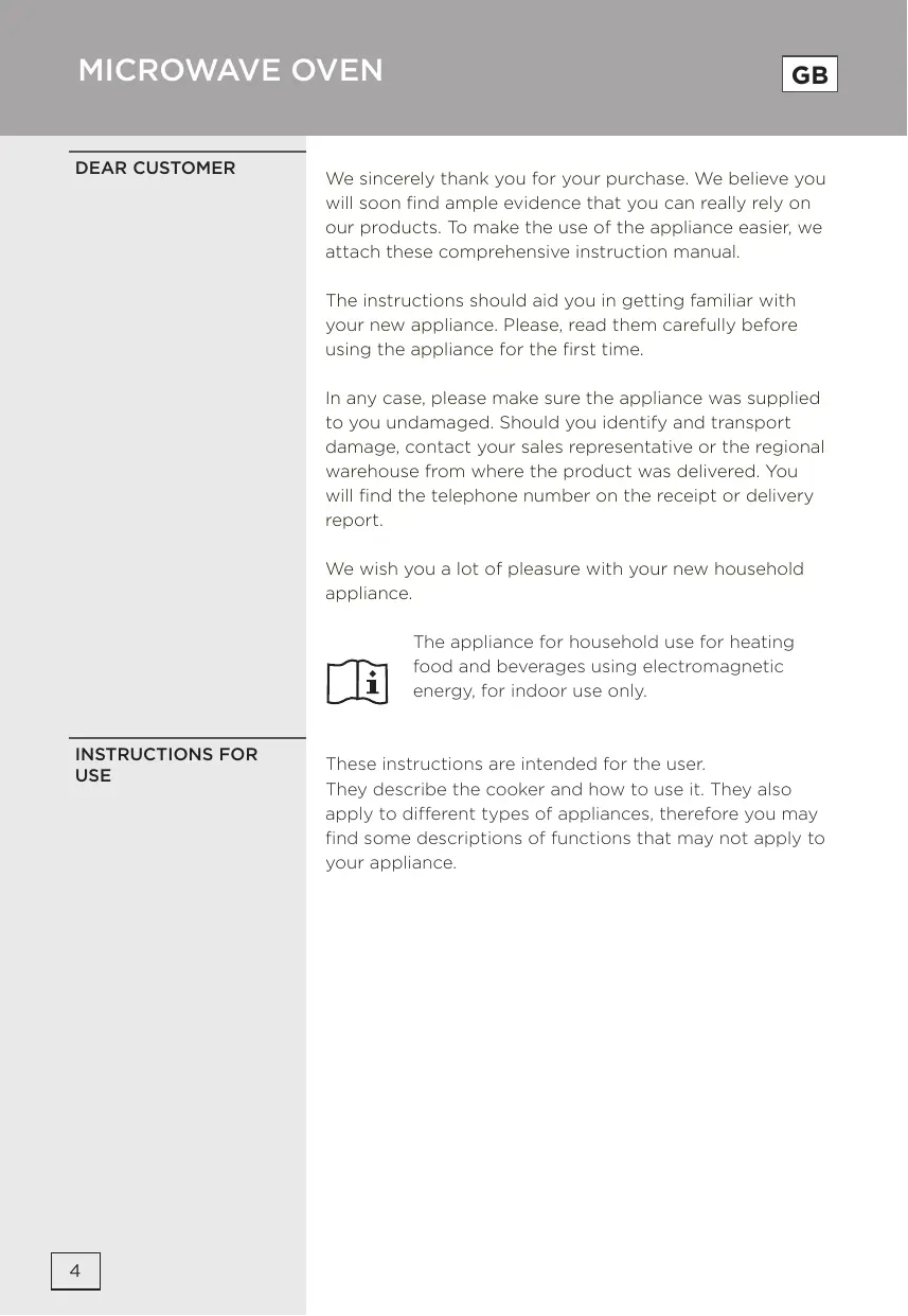 We sincerely thank you for your purchase. We believe you will soon find ample evidence that you can really rely on our products. To make the use of the appliance easier, we attach these comprehensive instruction manual. The instructions should aid you in getting familiar with your new appliance. Please, read them carefully before using the appliance for the first time. In any case, please make sure the appliance was supplied to you undamaged. Should you identify and transport damage, contact your sales representative or the regional warehouse from where the product was delivered. You will find the telephone number on the receipt or delivery report. We wish you a lot of pleasure with your new household appliance. The appliance for household use for heating food and beverages using electromagnetic energy, for indoor use only. INSTRUCTIONS FOR USE