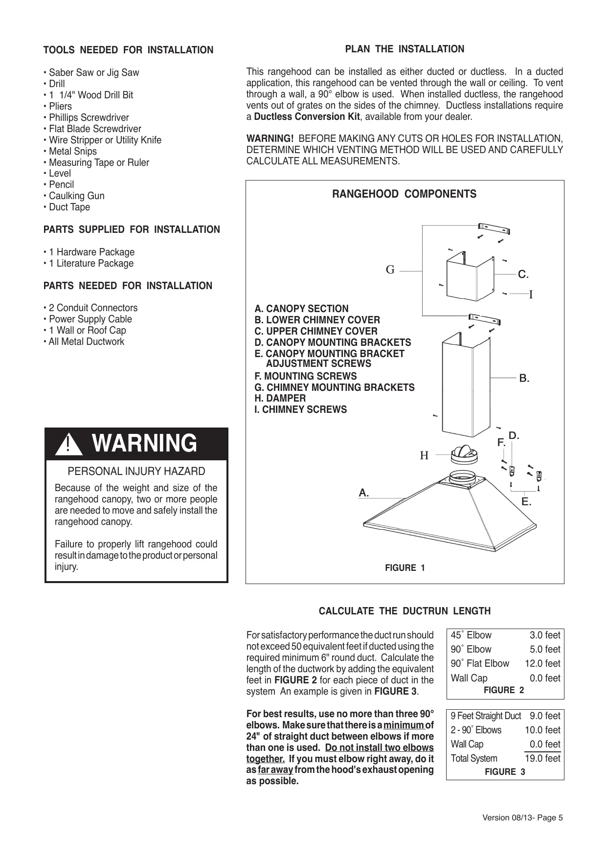 This rangehood can be installed as either ducted or ductless. In a ducted application, this rangehood can be vented through the wall or ceiling. To vent through a wall, a 90° elbow is used. When installed ductless, the rangehood vents out of grates on the sides of the chimney. Ductless installations require a Ductless Conversion Kit, available from your dealer. WARNING! BEFORE MAKING ANY CUTS OR HOLES FOR INSTALLATION, DETERMINE WHICH VENTING METHOD WILL BE USED AND CAREFULLY CALCULATE ALL MEASUREMENTS. RANGEHOOD COMPONENTS