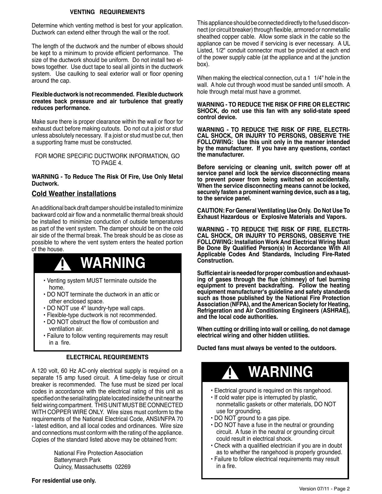 AVERTISSEMENT: - POUR PRÉVENIR LES BLESSURES EN CAS DE FEU SUIVRE LES RECOMMANDATIONS SUIVANTES (*): a) ÉTOUFFEZ LE FEU avec un couvercle métallique et fermez le brûleur. Si le feu ne s'éteint pas tout de suite, QUITTEZ LES LIEUX ET APPELEZ LES POMPIERS. b) NE TOUCHEZ JAMAIS UNE CASSEROLE EN FLAMMES. c) N'UTILISEZ JAMAIS DE L'EAU ou un torchon mouillé pour éteindre le feu - ce qui pourrait causer une explosion de vapeur. d) N'utilisez un extincteur que si: 1. Vous avez un modèle ABC et vous connaissez bien son mode d'emploi. 2. Le feu est petit et peu répandu. 3. Les pompiers sont déjà prévenus. 4. Vous avez une sortie derrière vous. (*) Basé sur la "cuisine Firesafety incline" édité par NFPA. TOUTE OUVERTURE DANS LE MUR OU LE PLANCHER À PROXIMITÉ DE LA HOTTE DOIT ÊTRE SCELLÉ Gardez 24 po. de hauteur entre le bas de la hotte et la surface de cuisson. Cette hauteur minimum peut être plus haute suivant le code municipal. Par exemple, les cuisinières à gaz peuvent requérir 30 po. de hauteur. Les armoires au-dessus de chaque côté devront être au moins à 18 po. au-dessus de la surface de cuisson. Consultez la fiche technique avant de découper les armoires. Version 07/11 - Page 1