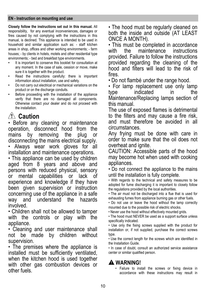 - Before any cleaning or maintenance operation, disconnect hood from the mains by removing the plug or disconnecting the mains electrical supply.