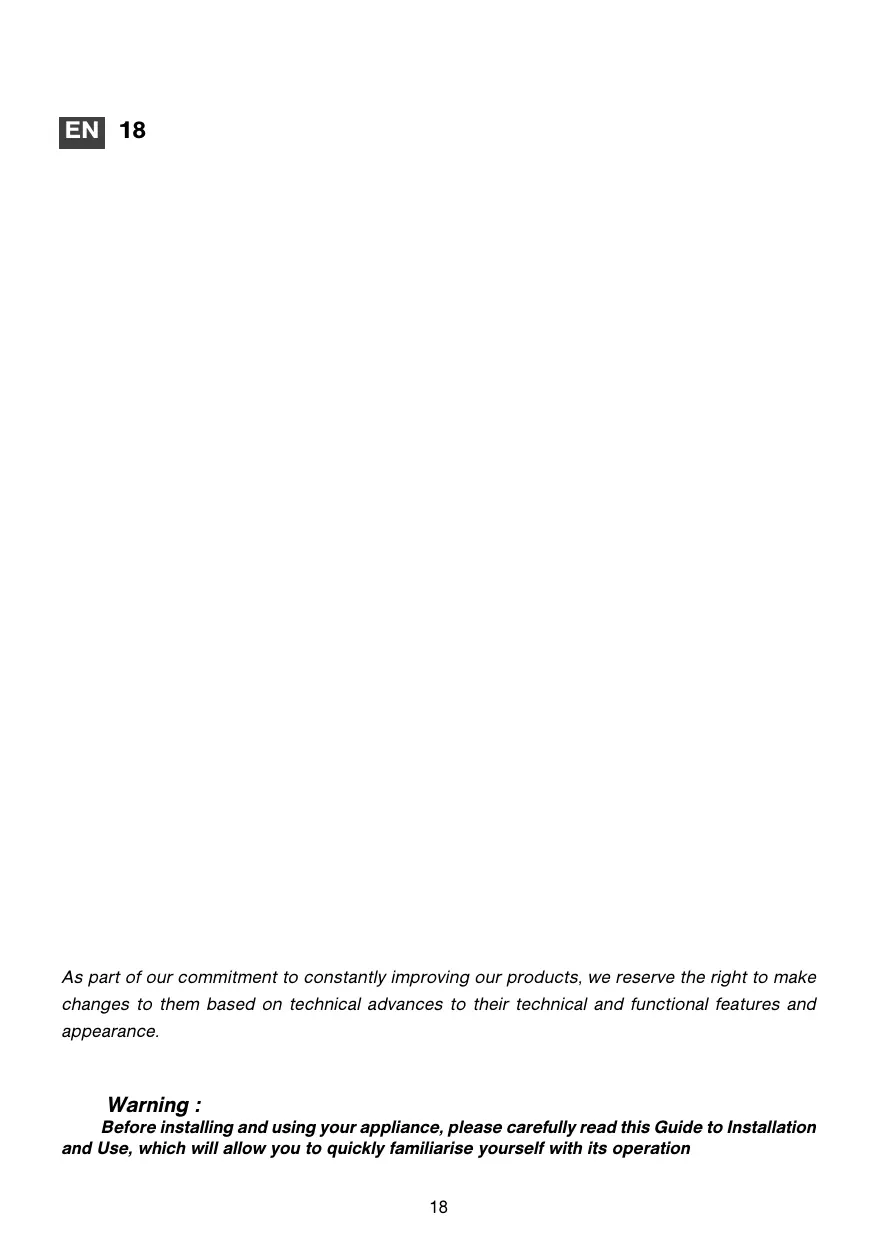 Before installing and using your appliance, please carefully read this Guide to Installation and Use, which will allow you to quickly familiarise yourself with its operation 18