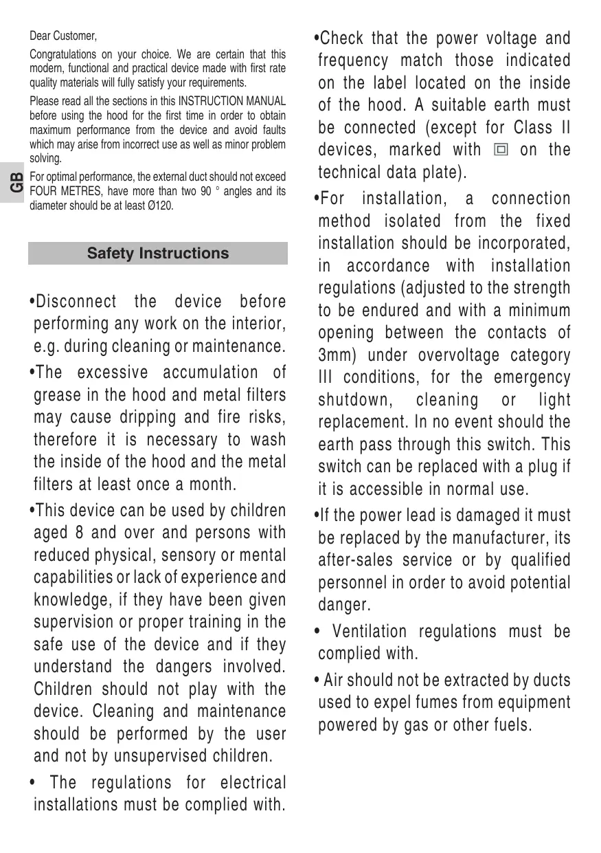 Dear Customer, Congratulations on your choice. We are certain that this modern, functional and practical device made with first rate quality materials will fully satisfy your requirements. Please read all the sections in this INSTRUCTION MANUAL before using the hood for the first time in order to obtain maximum performance from the device and avoid faults which may arise from incorrect use as well as minor problem solving. For optimal performance, the external duct should not exceed FOUR METRES, have more than two 90 ° angles and its diameter should be at least Ø120.