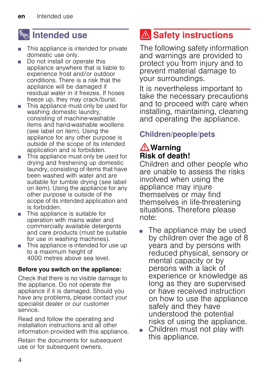 This appliance is intended for private domestic use only. Do not install or operate this appliance anywhere that is liable to experience frost and/or outdoor conditions. There is a risk that the appliance will be damaged if residual water in it freezes. If hoses freeze up, they may crack/burst. This appliance must only be used for washing domestic laundry, consisting of machine-washable items and hand-washable woollens (see label on item). Using the appliance for any other purpose is outside of the scope of its intended application and is forbidden. This appliance must only be used for drying and freshening up domestic laundry, consisting of items that have been washed with water and are suitable for tumble drying (see label on item). Using the appliance for any other purpose is outside of the scope of its intended application and is forbidden. This appliance is suitable for operation with mains water and commercially available detergents and care products (must be suitable for use in washing machines). This appliance is intended for use up to a maximum height of 4000 metres above sea level.