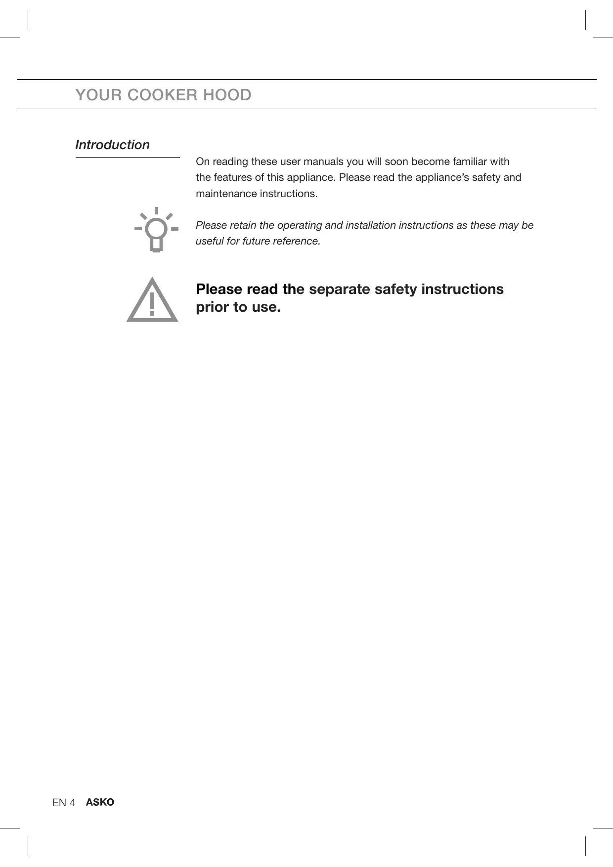 - CFC-free polystyrene (PS-rigid foam); Dispose of these materials in a responsible manner and in accordance with government regulations. The product has been marked with a crossed-out dustbin symbol to remind you of the obligation to dispose of electrical household appliances separately. This means that the appliance may not be included with normal domestic refuse at the end of its service life. The appliance must be taken to a special municipal centre for separated waste collection or to a dealer providing this service. Separate processing of household appliances prevents the potentially negative consequences for the environment and health that can arise as a result of inappropriate processing. It ensures that the materials of which the appliance is composed can be recovered to obtain significant savings in energy and raw materials. EN 22 SOMMAIRE Votre hotte aspirante Introduction