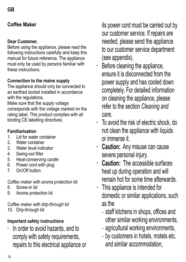 Coffee Maker Dear Customer, Before using the appliance, please read the following instructions carefully and keep this manual for future reference. The appliance must only be used by persons familiar with these instructions. Connection to the mains supply The appliance should only be connected to an earthed socket installed in accordance with the regulations. Make sure that the supply voltage corresponds with the voltage marked on the rating label. This product complies with all binding CE labelling directives. Familiarisation
