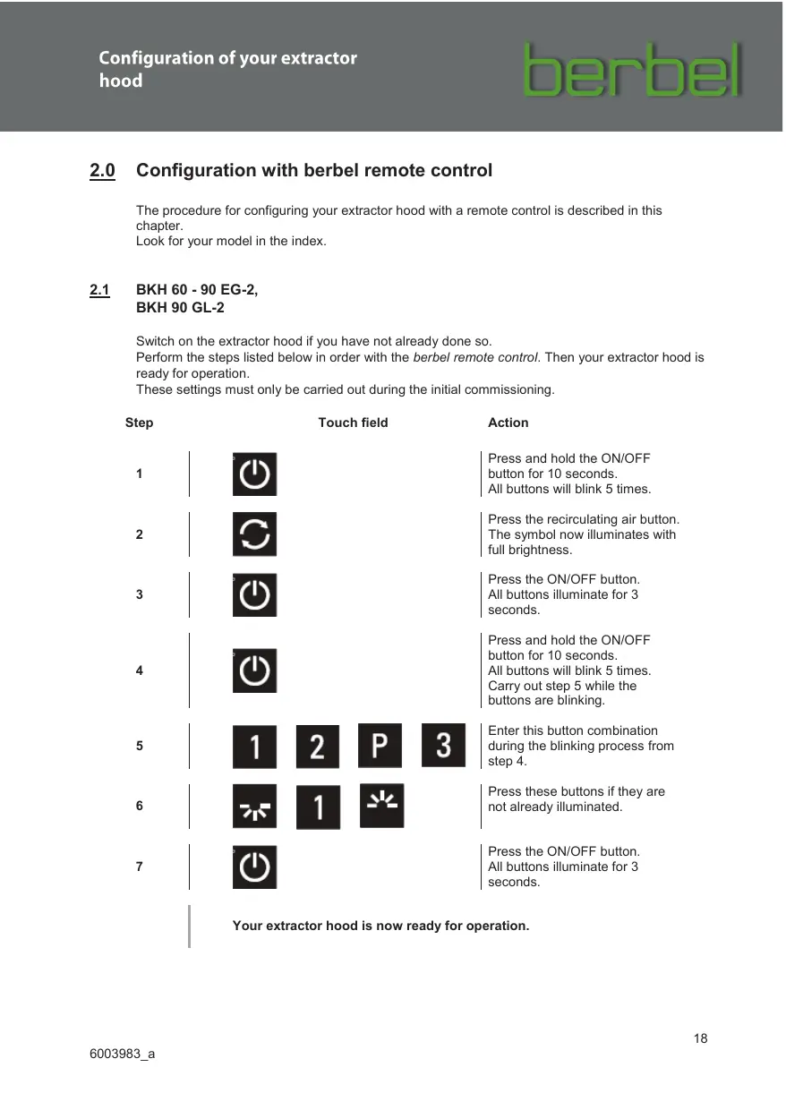 Refer to the sub-item in which your hood is specified in the chapter "Configuration with berbel remote control" or "Configuration with berbel control app".