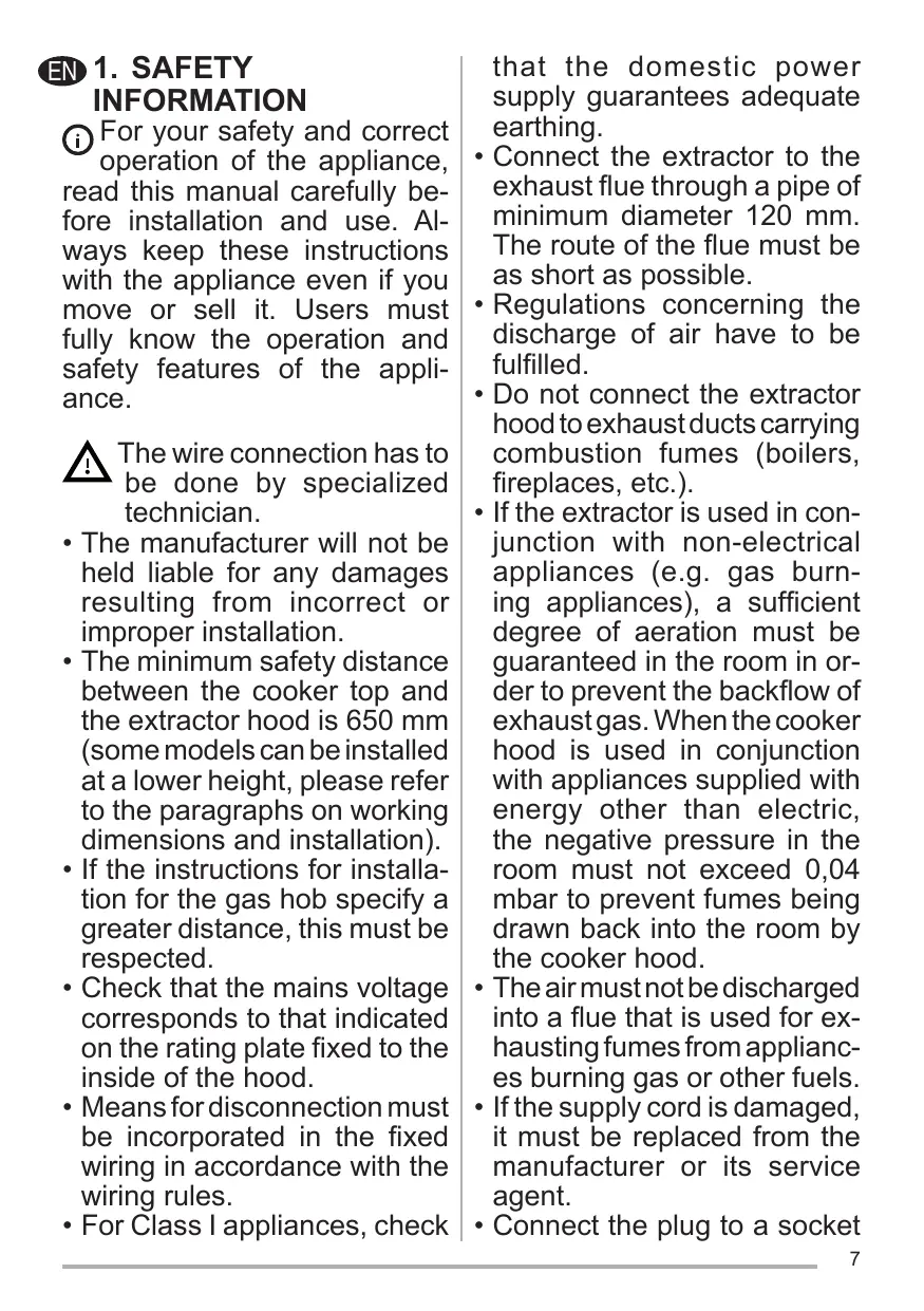 I, s’assurer que l’installation électrique de votre intérieur dispose d’une mise à la terre adéquate. Reliez l’aspirateur du conduit de cheminée avec un tube ayant un diamètre minimum de 120 mm. Le parcours des fumées doit être le plus court possible. Respecter toutes les normes concernant l’évacuation de l’air. Ne reliez pas la hotte aspirante aux conduits de cheminée qui acheminent les fumées de combustion (par ex. de chaudières, de cheminées, etc.). Si vous utilisez l’aspirateur en même temps que des appareils non électriques (par ex. fonctionnant au gaz), veillez à ce que la pièce soit adéquatement ventilée, afin d’empêcher le retour du flux des gaz d’évacuation. Si vous utilisez la hotte de cuisine en même temps que des appareils non alimentés à l’électricité, la pression négative dans la 11