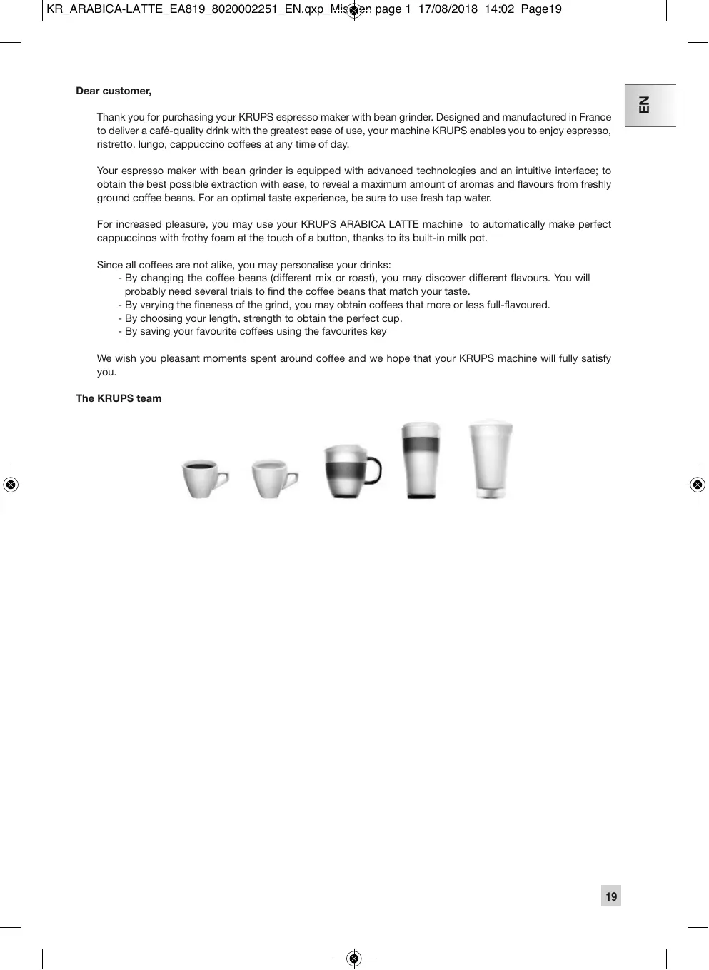 Thank you for purchasing your KRUPS espresso maker with bean grinder. Designed and manufactured in France to deliver a café-quality drink with the greatest ease of use, your machine KRUPS enables you to enjoy espresso, ristretto, lungo, cappuccino coffees at any time of day. Your espresso maker with bean grinder is equipped with advanced technologies and an intuitive interface; to obtain the best possible extraction with ease, to reveal a maximum amount of aromas and flavours from freshly ground coffee beans. For an optimal taste experience, be sure to use fresh tap water. For increased pleasure, you may use your KRUPS ARABICA LATTE machine to automatically make perfect cappuccinos with frothy foam at the touch of a button, thanks to its built-in milk pot. Since all coffees are not alike, you may personalise your drinks: - By changing the coffee beans (different mix or roast), you may discover different flavours. You will probably need several trials to find the coffee beans that match your taste. - By varying the fineness of the grind, you may obtain coffees that more or less full-flavoured. - By choosing your length, strength to obtain the perfect cup. - By saving your favourite coffees using the favourites key We wish you pleasant moments spent around coffee and we hope that your KRUPS machine will fully satisfy you. The KRUPS team