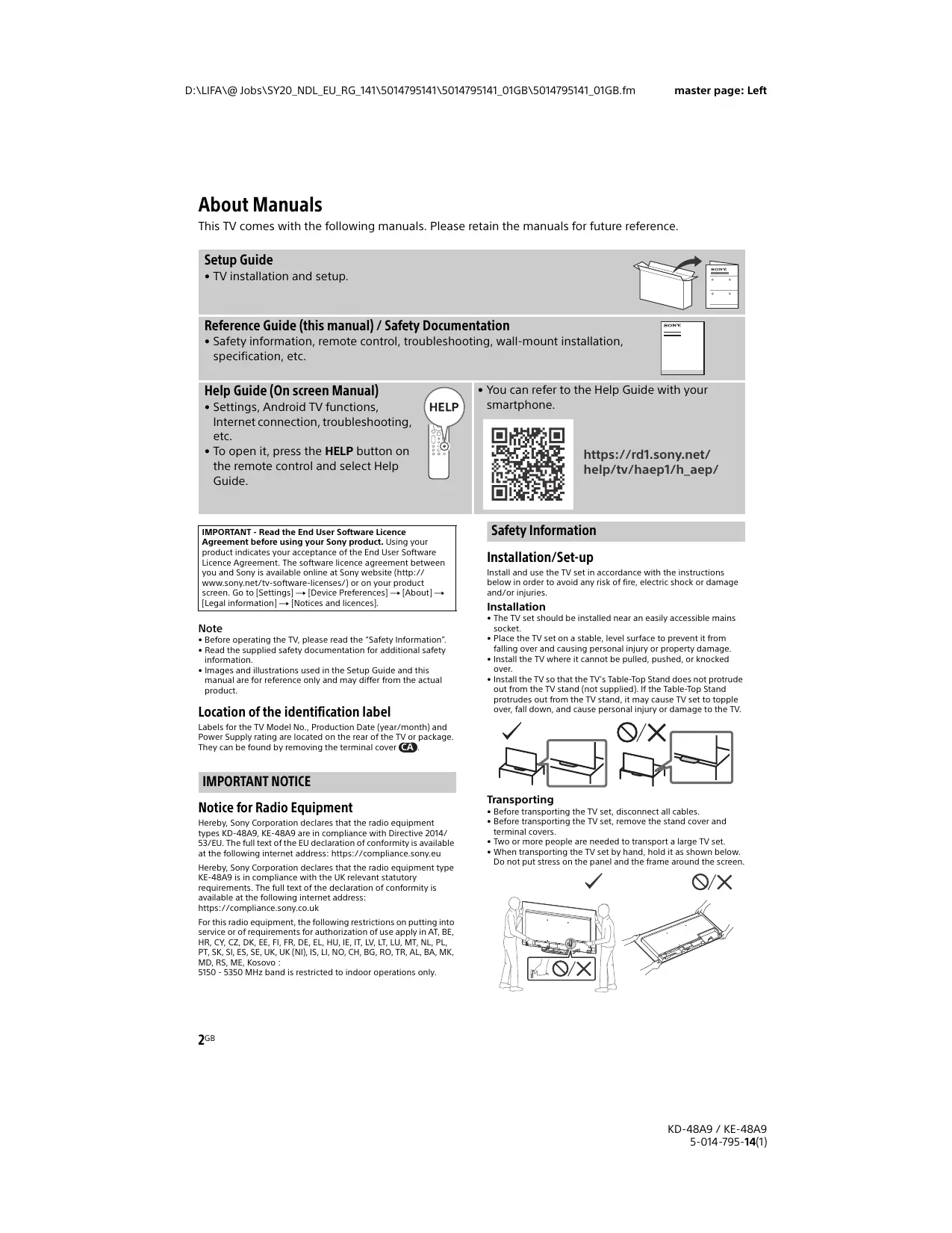 Hereby, Sony Corporation declares that the radio equipment types KD-48A9, KE-48A9 are in compliance with Directive 2014/ 53/EU. The full text of the EU declaration of conformity is available at the following internet address: https://compliance.sony.eu Hereby, Sony Corporation declares that the radio equipment type KE-48A9 is in compliance with the UK relevant statutory requirements. The full text of the declaration of conformity is available at the following internet address: https://compliance.sony.co.uk