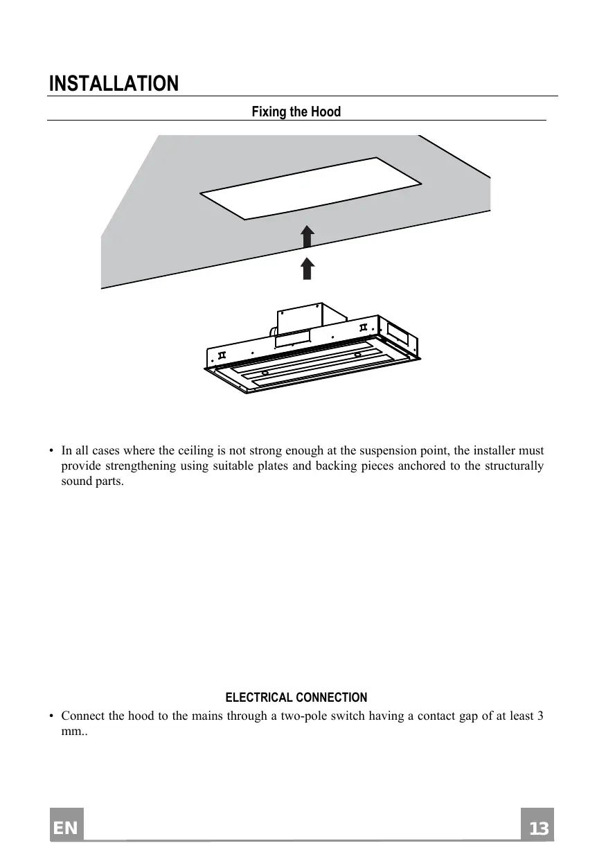 • Connect the hood to the mains through a two-pole switch having a contact gap of at least 3 mm..