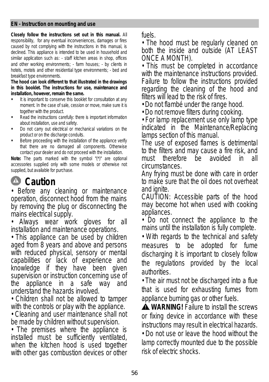 • Always wear work gloves for all installation and maintenance operations. • This appliance can be used by children aged from 8 years and above and persons with reduced physical, sensory or mental capabilities or lack of experience and knowledge if they have been given supervision or instruction concerning use of the appliance in a safe way and understand the hazards involved. • Children shall not be allowed to tamper with the controls or play with the appliance. • Cleaning and user maintenance shall not be made by children without supervision. • The premises where the appliance is installed must be sufficiently ventilated, when the kitchen hood is used together with other gas combustion devices or other 56