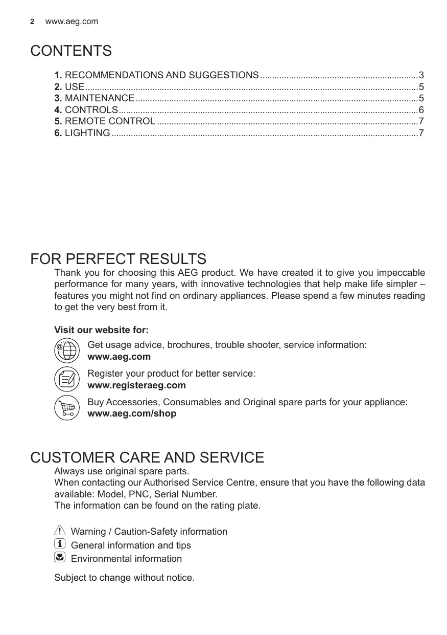 When contacting our Authorised Service Centre, ensure that you have the following data available: Model, PNC, Serial Number. The information can be found on the rating plate. Warning / Caution-Safety information General information and tips Environmental information Subject to change without notice.