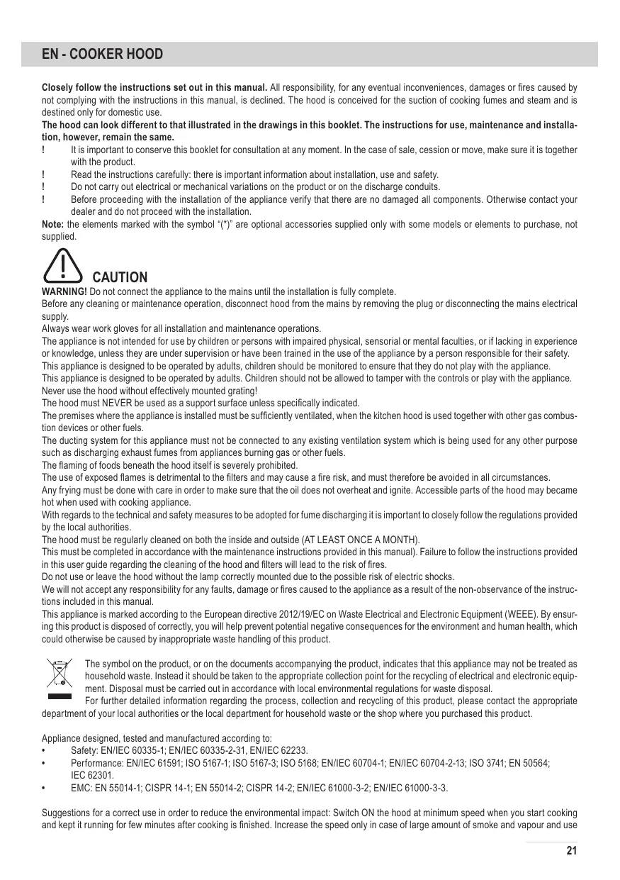 Before any cleaning or maintenance operation, disconnect hood from the mains by removing the plug or disconnecting the mains electrical supply. Always wear work gloves for all installation and maintenance operations. The appliance is not intended for use by children or persons with impaired physical, sensorial or mental faculties, or if lacking in experience or knowledge, unless they are under supervision or have been trained in the use of the appliance by a person responsible for their safety. This appliance is designed to be operated by adults, children should be monitored to ensure that they do not play with the appliance. This appliance is designed to be operated by adults. Children should not be allowed to tamper with the controls or play with the appliance. Never use the hood without effectively mounted grating! The hood must NEVER be used as a support surface unless specifically indicated. The premises where the appliance is installed must be sufficiently ventilated, when the kitchen hood is used together with other gas combustion devices or other fuels. The ducting system for this appliance must not be connected to any existing ventilation system which is being used for any other purpose such as discharging exhaust fumes from appliances burning gas or other fuels. The flaming of foods beneath the hood itself is severely prohibited. The use of exposed flames is detrimental to the filters and may cause a fire risk, and must therefore be avoided in all circumstances. Any frying must be done with care in order to make sure that the oil does not overheat and ignite. Accessible parts of the hood may became hot when used with cooking appliance. With regards to the technical and safety measures to be adopted for fume discharging it is important to closely follow the regulations provided by the local authorities. The hood must be regularly cleaned on both the inside and outside (AT LEAST ONCE A MONTH). This must be completed in accordance with the maintenance instructions provided in this manual). Failure to follow the instructions provided in this user guide regarding the cleaning of the hood and filters will lead to the risk of fires. Do not use or leave the hood without the lamp correctly mounted due to the possible risk of electric shocks. We will not accept any responsibility for any faults, damage or fires caused to the appliance as a result of the non-observance of the instructions included in this manual. This appliance is marked according to the European directive 2012/19/EC on Waste Electrical and Electronic Equipment (WEEE). By ensuring this product is disposed of correctly, you will help prevent potential negative consequences for the environment and human health, which could otherwise be caused by inappropriate waste handling of this product. The symbol on the product, or on the documents accompanying the product, indicates that this appliance may not be treated as household waste. Instead it should be taken to the appropriate collection point for the recycling of electrical and electronic equipment. Disposal must be carried out in accordance with local environmental regulations for waste disposal. For further detailed information regarding the process, collection and recycling of this product, please contact the appropriate department of your local authorities or the local department for household waste or the shop where you purchased this product. Appliance designed, tested and manufactured according to: •• Safety: EN/IEC 60335-1; EN/IEC 60335-2-31, EN/IEC 62233. •• Performance: EN/IEC 61591; ISO 5167-1; ISO 5167-3; ISO 5168; EN/IEC 60704-1; EN/IEC 60704-2-13; ISO 3741; EN 50564; IEC 62301. •• EMC: EN 55014-1; CISPR 14-1; EN 55014-2; CISPR 14-2; EN/IEC 61000-3-2; EN/IEC 61000-3-3. Suggestions for a correct use in order to reduce the environmental impact: Switch ON the hood at minimum speed when you start cooking and kept it running for few minutes after cooking is finished. Increase the speed only in case of large amount of smoke and vapour and use
