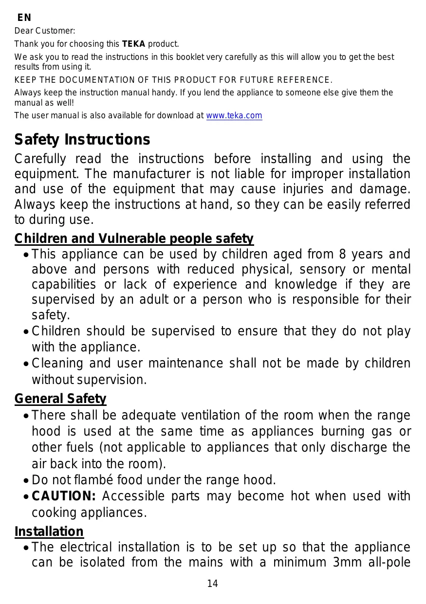 Thank you for choosing this TEKA product. We ask you to read the instructions in this booklet very carefully as this will allow you to get the best results from using it. KEEP THE DOCUMENTATION OF THIS PRODUCT FOR FUTURE REFERENCE. Always keep the instruction manual handy. If you lend the appliance to someone else give them the manual as well! The user manual is also available for download at www.teka.com