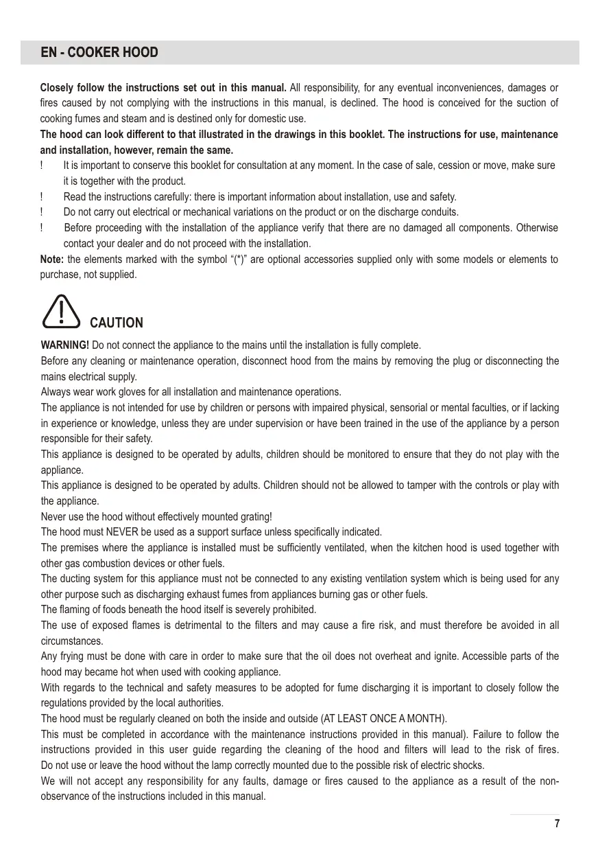 EN - COOKER HOOD Closely follow the instructions set out in this manual. All responsibility, for any eventual inconveniences, damages or