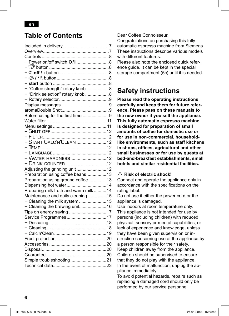 TE_506_509_1RW.indb 24 Bien surveiller les enfants ain de les empêcher de jouer avec l’appareil. En cas de défaut, débrancher immédiatement le cordon électrique. Les réparations sur la machine, par ex. le remplacement du cordon électrique, doivent être effectuées uniquement par notre Service après-vente ain d’éliminer tous les risques. Ne jamais plonger la machine ou le cordon électrique dans l’eau. Ne pas glisser les doigts à l’intérieur du moulin. Utiliser la machine uniquement dans des locaux à l’abri du gel.