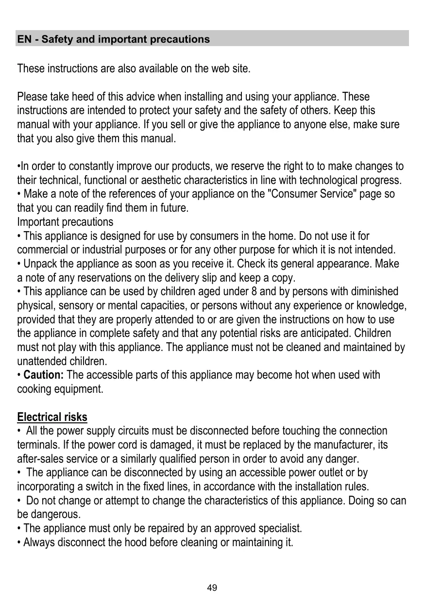Please take heed of this advice when installing and using your appliance. These instructions are intended to protect your safety and the safety of others. Keep this manual with your appliance. If you sell or give the appliance to anyone else, make sure that you also give them this manual. •In order to constantly improve our products, we reserve the right to to make changes to their technical, functional or aesthetic characteristics in line with technological progress. • Make a note of the references of your appliance on the "Consumer Service" page so that you can readily find them in future. Important precautions • This appliance is designed for use by consumers in the home. Do not use it for commercial or industrial purposes or for any other purpose for which it is not intended. • Unpack the appliance as soon as you receive it. Check its general appearance. Make a note of any reservations on the delivery slip and keep a copy. • This appliance can be used by children aged under 8 and by persons with diminished physical, sensory or mental capacities, or persons without any experience or knowledge, provided that they are properly attended to or are given the instructions on how to use the appliance in complete safety and that any potential risks are anticipated. Children must not play with this appliance. The appliance must not be cleaned and maintained by unattended children. • Caution: The accessible parts of this appliance may become hot when used with cooking equipment. Electrical risks • All the power supply circuits must be disconnected before touching the connection terminals. If the power cord is damaged, it must be replaced by the manufacturer, its after-sales service or a similarly qualified person in order to avoid any danger. • The appliance can be disconnected by using an accessible power outlet or by incorporating a switch in the fixed lines, in accordance with the installation rules. • Do not change or attempt to change the characteristics of this appliance. Doing so can be dangerous. • The appliance must only be repaired by an approved specialist. • Always disconnect the hood before cleaning or maintaining it.