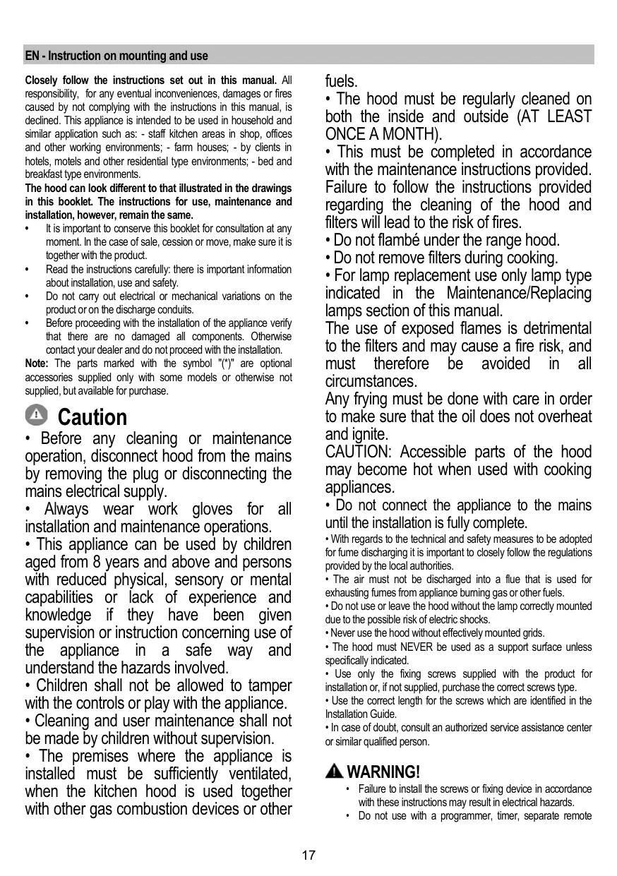 • The hood must be regularly cleaned on both the inside and outside (AT LEAST ONCE A MONTH). • This must be completed in accordance with the maintenance instructions provided. Failure to follow the instructions provided regarding the cleaning of the hood and filters will lead to the risk of fires. • Do not flambé under the range hood. • Do not remove filters during cooking. • For lamp replacement use only lamp type indicated in the Maintenance/Replacing lamps section of this manual. The use of exposed flames is detrimental to the filters and may cause a fire risk, and must therefore be avoided in all circumstances. Any frying must be done with care in order to make sure that the oil does not overheat and ignite. CAUTION: Accessible parts of the hood may become hot when used with cooking appliances.