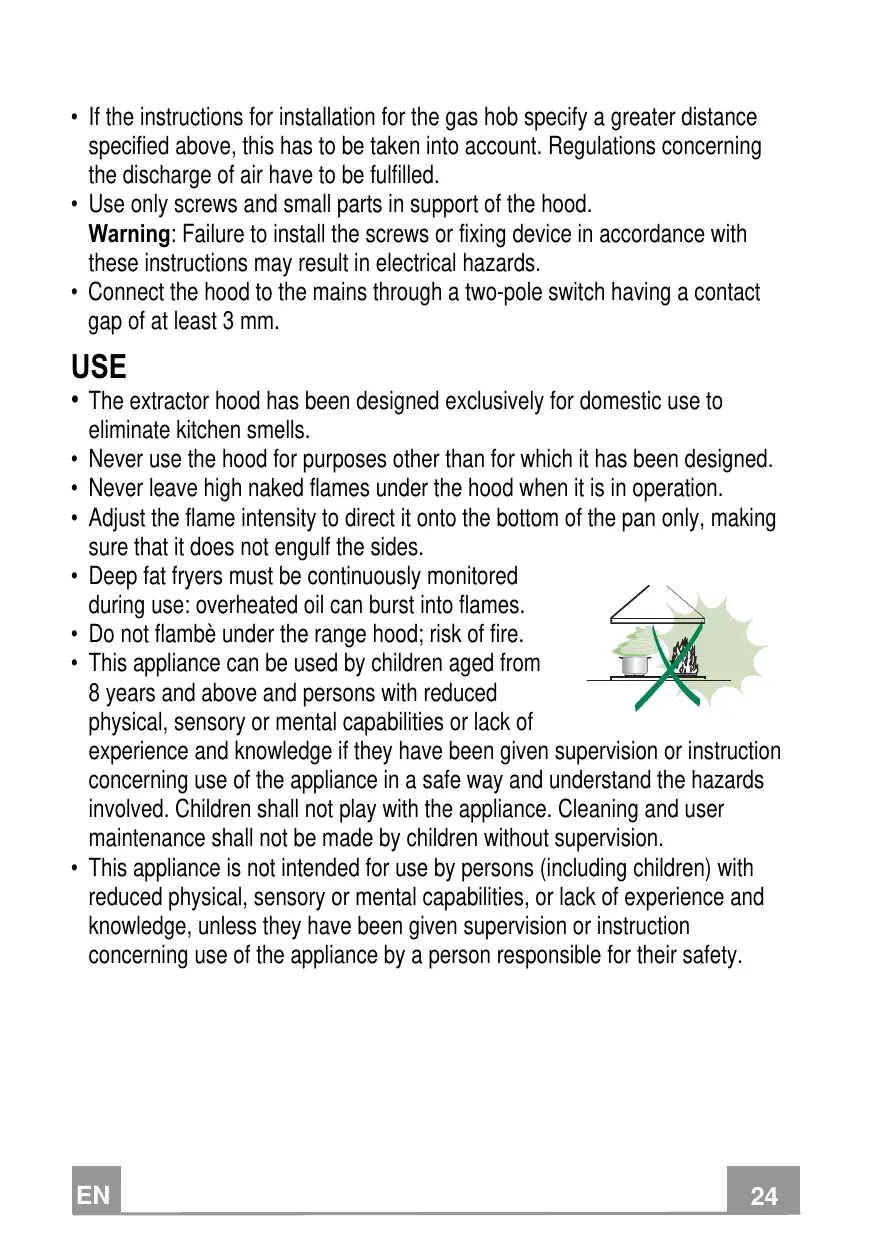 Never use the hood for purposes other than for which it has been designed. Never leave high naked flames under the hood when it is in operation. Adjust the flame intensity to direct it onto the bottom of the pan only, making sure that it does not engulf the sides. Deep fat fryers must be continuously monitored during use: overheated oil can burst into flames. Do not flambè under the range hood; risk of fire. This appliance can be used by children aged from 8 years and above and persons with reduced physical, sensory or mental capabilities or lack of experience and knowledge if they have been given supervision or instruction concerning use of the appliance in a safe way and understand the hazards involved. Children shall not play with the appliance. Cleaning and user maintenance shall not be made by children without supervision. This appliance is not intended for use by persons (including children) with reduced physical, sensory or mental capabilities, or lack of experience and knowledge, unless they have been given supervision or instruction concerning use of the appliance by a person responsible for their safety.