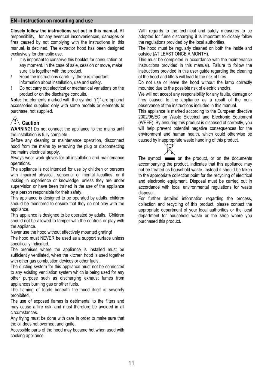 EN - Instruction on mounting and use Closely follow the instructions set out in this manual. All responsibility, for any eventual inconveniences, damages or fires caused by not complying with the instructions in this manual, is declined. The extractor hood has been designed exclusively for domestic use. ! It is important to conserve this booklet for consultation at any moment. In the case of sale, cession or move, make sure it is together with the product. ! Read the instructions carefully: there is important information about installation, use and safety. ! Do not carry out electrical or mechanical variations on the product or on the discharge conduits. Note: the elements marked with the symbol “(*)” are optional accessories supplied only with some models or elements to purchase, not supplied.