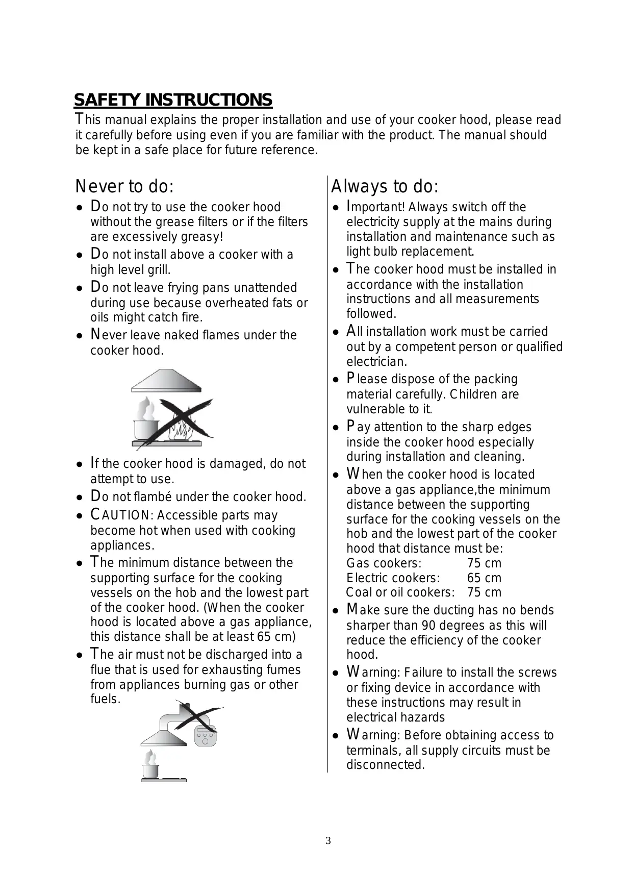 ● La hotte de cuisson doit être installée suivant les instructions d’installation et toutes les mesures ci-dessous : ● Toute l’installation doit être prise en charge par une personne compétente ou un électricien professionnel. ● Veillez à l’élimination des matériaux d’emballage. Il peut représenter un danger pour les enfants. ● Faites bien attention aux bords aiguisés à l’intérieur de la hotte, notamment pendant l’installation et le nettoyage. ● Quand la hotte est installée au-dessus d’un appareil à gaz, la distance minimale entre la surface d’appui des récipients de cuisson sur la plaque et la partie la plus basse de la hotte doit être : Gazinière : 75 cm ● Attention : Le fait de ne pas installer les vis ou le dispositif de fixation conformément à ces instructions peut entraîner des risques électriques. ● Attention : Avant d’accéder aux appareils, tous les circuits d’alimentation doivent être coupés.