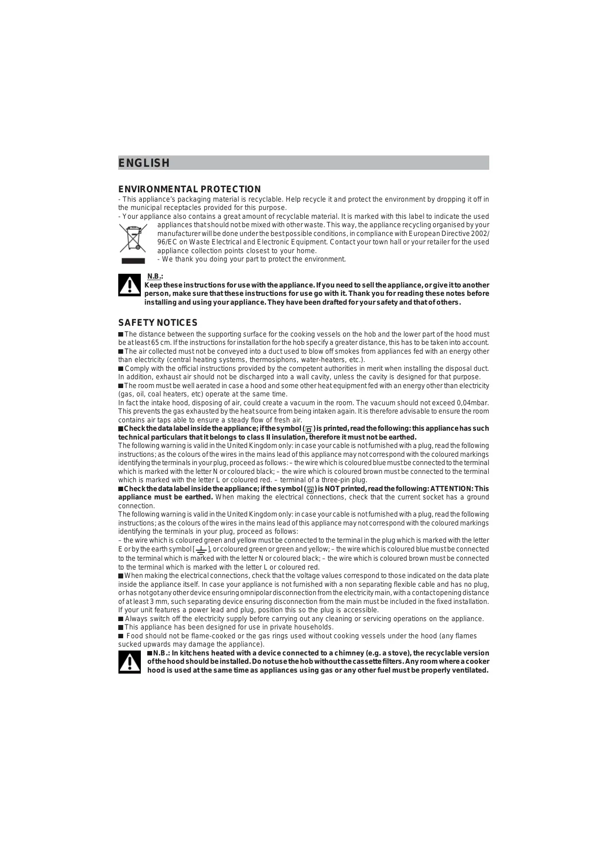 The air collected must not be conveyed into a duct used to blow off smokes from appliances fed with an energy other than electricity (central heating systems, thermosiphons, water-heaters, etc.). Comply with the official instructions provided by the competent authorities in merit when installing the disposal duct. In addition, exhaust air should not be discharged into a wall cavity, unless the cavity is designed for that purpose. The room must be well aerated in case a hood and some other heat equipment fed with an energy other than electricity (gas, oil, coal heaters, etc) operate at the same time. In fact the intake hood, disposing of air, could create a vacuum in the room. The vacuum should not exceed 0,04mbar. This prevents the gas exhausted by the heat source from being intaken again. It is therefore advisable to ensure the room contains air taps able to ensure a steady flow of fresh air. Check the data label inside the appliance; if the symbol ( ) is printed, read the following: this appliance has such technical particulars that it belongs to class II insulation, therefore it must not be earthed. The following warning is valid in the United Kingdom only: in case your cable is not furnished with a plug, read the following instructions; as the colours of the wires in the mains lead of this appliance may not correspond with the coloured markings identifying the terminals in your plug, proceed as follows: – the wire which is coloured blue must be connected to the terminal which is marked with the letter N or coloured black; – the wire which is coloured brown must be connected to the terminal which is marked with the letter L or coloured red. – terminal of a three-pin plug. Check the data label inside the appliance; if the symbol ( ) is NOT printed, read the following: ATTENTION: This appliance must be earthed. When making the electrical connections, check that the current socket has a ground connection. The following warning is valid in the United Kingdom only: in case your cable is not furnished with a plug, read the following instructions; as the colours of the wires in the mains lead of this appliance may not correspond with the coloured markings identifying the terminals in your plug, proceed as follows: – the wire which is coloured green and yellow must be connected to the terminal in the plug which is marked with the letter E or by the earth symbol [ ], or coloured green or green and yellow; – the wire which is coloured blue must be connected to the terminal which is marked with the letter N or coloured black; – the wire which is coloured brown must be connected to the terminal which is marked with the letter L or coloured red. When making the electrical connections, check that the voltage values correspond to those indicated on the data plate inside the appliance itself. In case your appliance is not furnished with a non separating flexible cable and has no plug, or has not got any other device ensuring omnipolar disconnection from the electricity main, with a contact opening distance of at least 3 mm, such separating device ensuring disconnection from the main must be included in the fixed installation. If your unit features a power lead and plug, position this so the plug is accessible. Always switch off the electricity supply before carrying out any cleaning or servicing operations on the appliance. This appliance has been designed for use in private households. Food should not be flame-cooked or the gas rings used without cooking vessels under the hood (any flames sucked upwards may damage the appliance). N.B.: In kitchens heated with a device connected to a chimney (e.g. a stove), the recyclable version of the hood should be installed. Do not use the hob without the cassette filters. Any room where a cooker hood is used at the same time as appliances using gas or any other fuel must be properly ventilated.