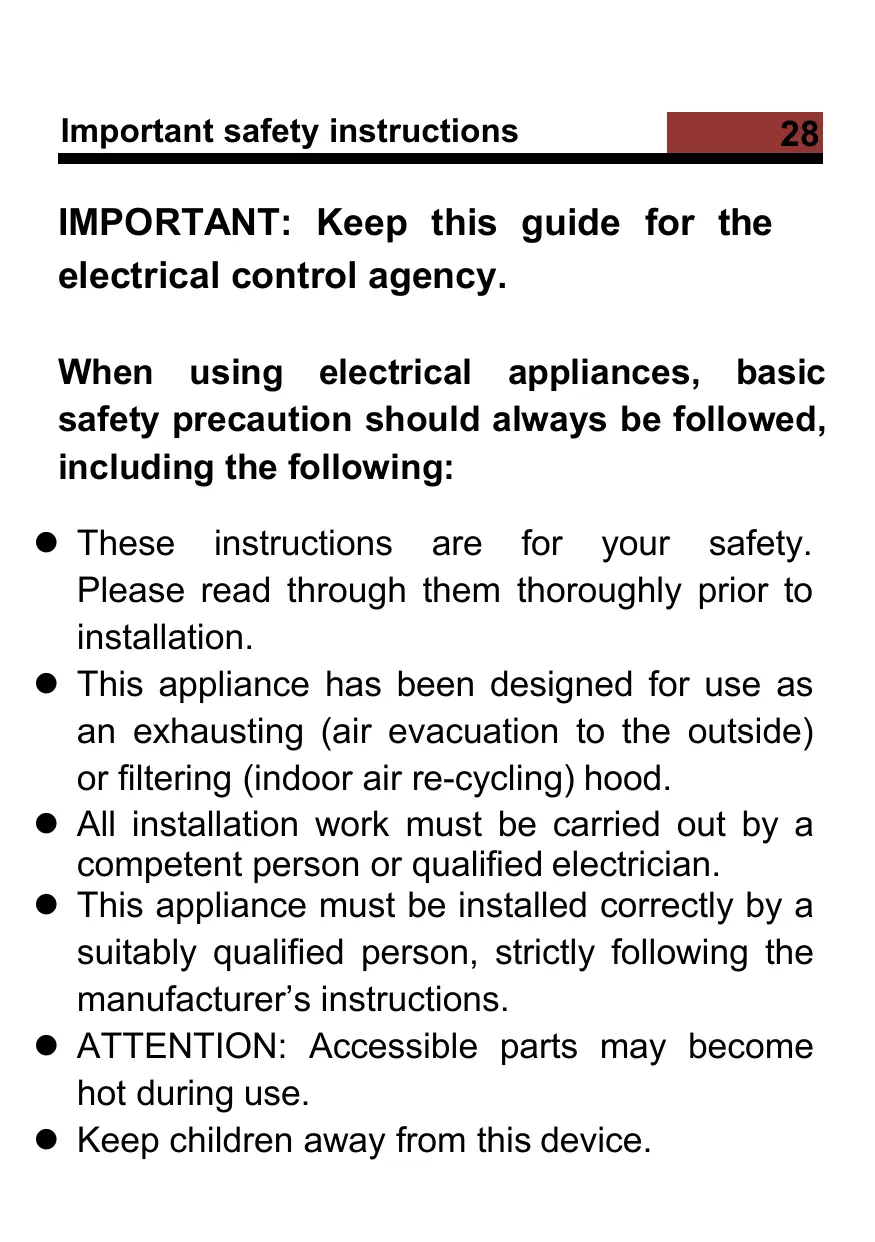 Cet appareil a été conçu pour être utilisé comme une hotte aspirante (l’évacuation de l’air à l’extérieur) ou une hotte filtrante (le recyclage de l’air à l’intérieur). Tous les travaux d’installation doivent être effectués par une personne compétente ou un électricien qualifié. Cet appareil doit être installé correctement par un personnel qualifié, en suivant strictement les instructions du fabricant. ATTENTION : Les surfaces accessibles peuvent devenir chaudes pendant l’utilisation avec des appareils de cuisson. Gardez les enfants éloignés de cet appareil.