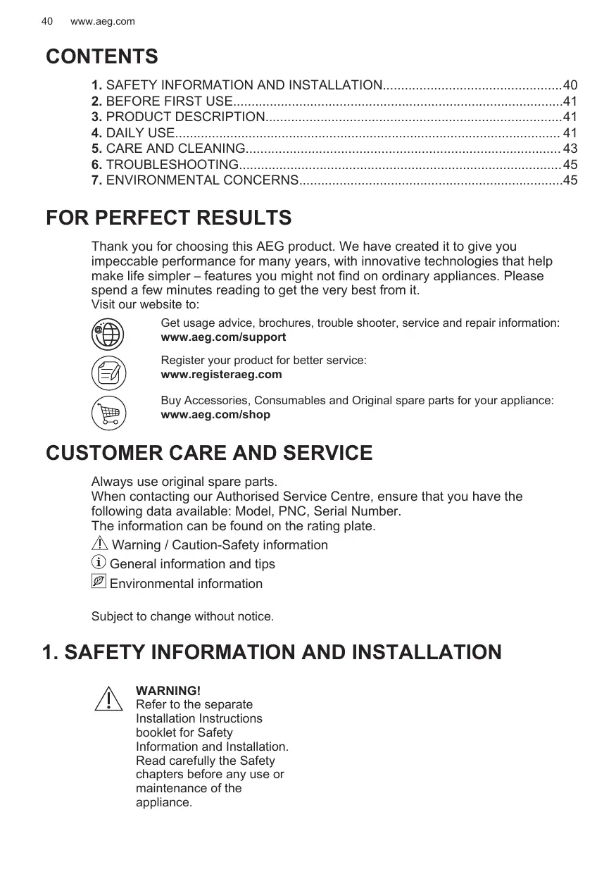 FOR PERFECT RESULTS Thank you for choosing this AEG product. We have created it to give you impeccable performance for many years, with innovative technologies that help make life simpler – features you might not find on ordinary appliances. Please spend a few minutes reading to get the very best from it. Visit our website to:
