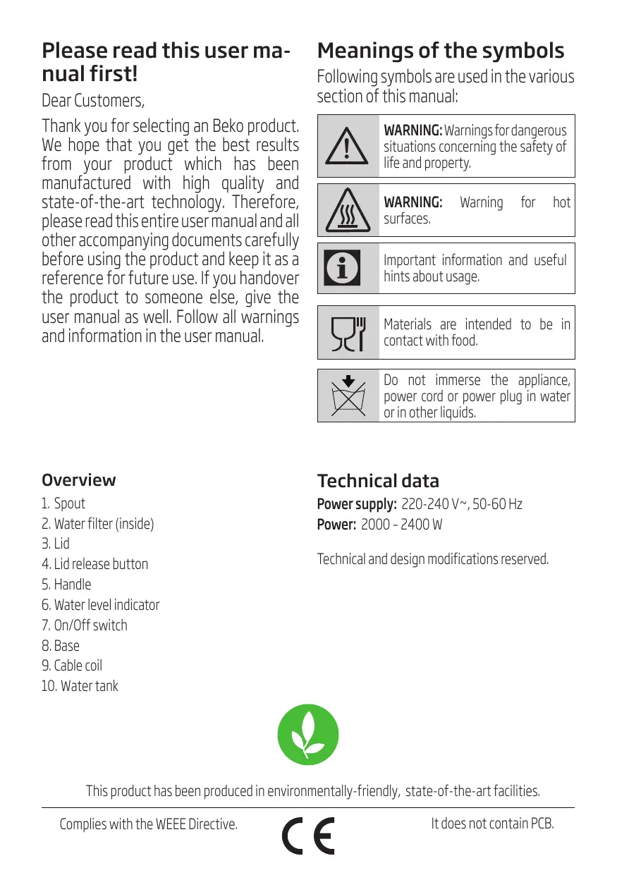 Thank you for selecting an Beko product. We hope that you get the best results from your product which has been manufactured with high quality and state-of-the-art technology. Therefore, please read this entire user manual and all other accompanying documents carefully before using the product and keep it as a reference for future use. If you handover the product to someone else, give the user manual as well. Follow all warnings and information in the user manual.