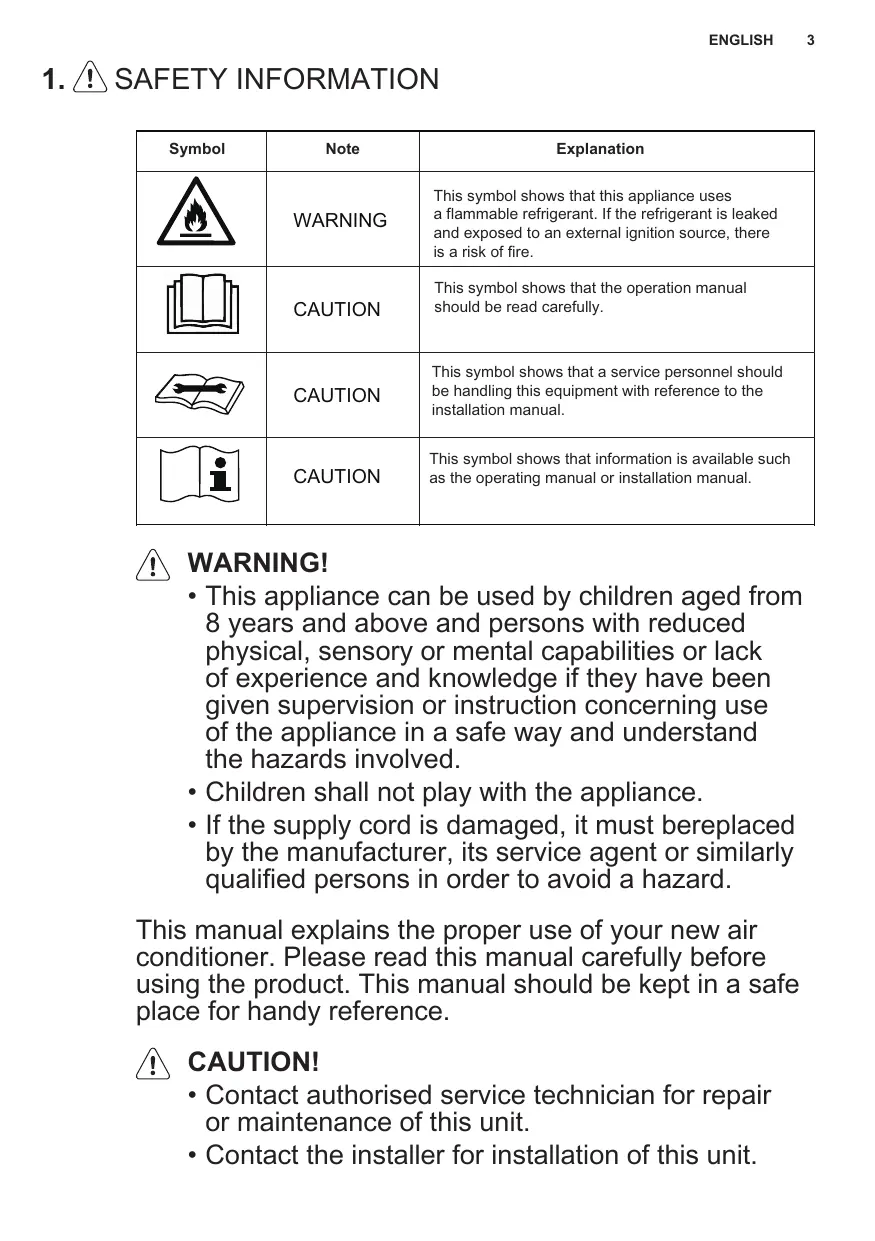 WARNING! Warning during usage 10 www.electrolux.com Warning Meaning Plug in power plug properly Otherwise, it may cause electric shock, fire and explosion due to excess heat generation Do not operate or stop the unit by inserting or pulling out Die power plug It may cause electric shock, fire and explosion due to heat generation Do not damage or use an unspecified power cord It may cause electric shock, fire and explosion. If the power cord is damaged, it must be replaced by the manufacturer or an authorised service centre or a similarly qualified person in order to avoid a hazard Do not modify power cord length or share the outlet with other appliances It may cause electric shock, fire and explosion due to heat generation Do not operate with wet hands or in damp environment It may cause electric shock Do not direct airflow at room occupants This could harm your health Always ensure effective earthing Incorrect earthing may cause electric shock Do not allow water to run into electric parts It may cause failure of unit or electric shock Always install circuit breaker and a dedicated power circuit Incorrect installation may cause electric shock, fire and explosion Unplug the unit if strange sounds, smell, or smoke comes from it It may cause electric shock, fire and explosion Do not use the socket if it is loose or damaged It may cause electric shock, fire and explosion Do not open the unit during operation It may cause electric shock, fire and explosion Keep firearms away It may cause fire and explosion Do not use the power cord close to heating appliances It may cause electric shock, fire and explosion Do not use the power cord near flammable gas or combustibles, such as gasoline, benzene, thinner, etc. It may cause electric shock, fire and explosion Ventilate room before operating air conditioner if there is a gas leakage from another appliance It may cause explosion, fire, explosion and burns Do not disassemble or modify unit It may cause failure and electric shock ENGLISH