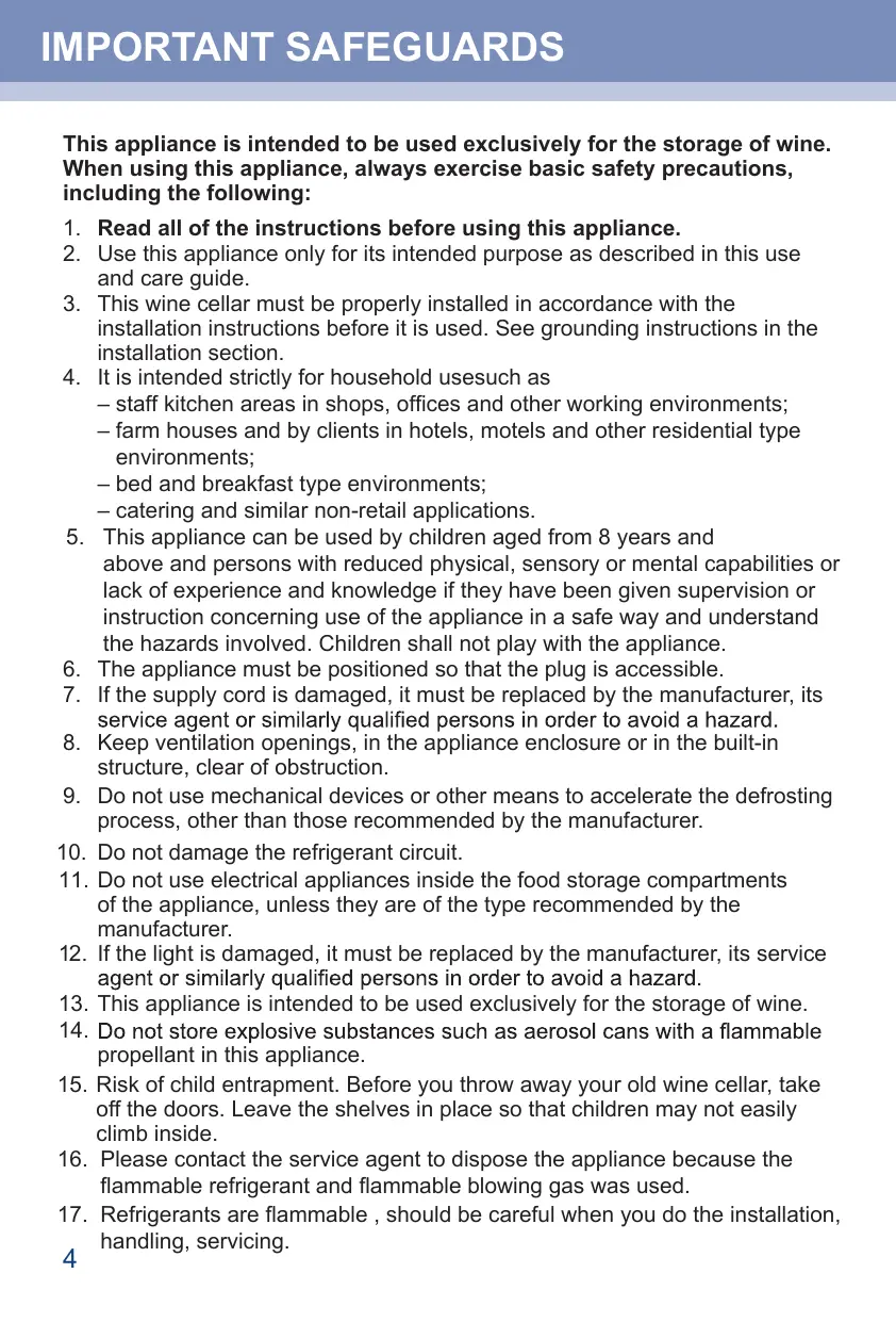 Heading 1 SAFEGUARDS IMPORTANT This appliance is intended to be used exclusively for the storage of wine.