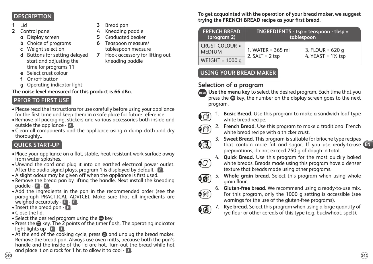 1. Basic Bread. Use this program to make a sandwich loaf type white bread recipe. 2. French Bread. Use this program to make a traditional French white bread recipe with a thicker crust. 3. Sweet Bread. This program is suitable for brioche type recipes that contain more fat and sugar. If you use ready-to-use EN preparations, do not exceed 750 g of dough in total. 4. Quick Bread. Use this program for the most quickly baked white breads. Breads made using this program have a denser texture that breads made using other programs. 5. Whole grain bread. Select this program when using whole grain flour. 6. Gluten-free bread. We recommend using a ready-to-use mix. For this program, only the 1000 g setting is accessible (see warnings for the use of the gluten-free programs). 7. Rye bread. Select this program when using a large quantity of rye flour or other cereals of this type (e.g. buckwheat, spelt).