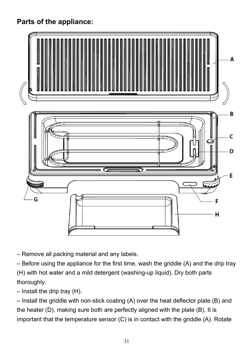 1. Retirez tout l’emballage et toutes les étiquettes. 2. Utilisez un chiffon humide ou une éponge pour essuyer la plaque à frire des deux côtés (nervurée et lisse), en éliminant toute poussière accumulée. Essuyez la plaque à frire à l’aide d’un chiffon doux ou d’une serviette en papier. 3. Choisissez l’endroit où vous utiliserez l’appareil. Laissez suffisamment d’espace entre l’arrière de l’appareil et le mur, pour vous assurer que la chaleur rayonnée par l’appareil n’endommage pas les placards ou les murs de la cuisine. 4. Réglez la molette de réglage de la température (E) sur la position désactivée (faites-le tourner dans le sens horaire). 5. Connectez l’appareil à l'alimentation principale qui est conforme aux spécifications figurant sur la plaque signalétique ou l’étiquette. Lorsque l’appareil est mis sous tension, le voyant blanc (F) s’allume. 6. Utilisez la molette de réglage de la température (E) pour régler une température basse pour le préchauffage de la plaque à frire. Ensuite, réglez la température appropriée en fonction de la nourriture que vous souhaitez griller. 7. N’utilisez pas d’ustensiles en métal pour enlever la graisse ou les aliments, car ceux-ci peuvent endommager le revêtement antiadhésif. Utilisez toujours une spatule ou un autre accessoire résistant à la chaleur en bois ou en silicone. 8. Pendant le grillage, assurez-vous que les jus ou autres liquides qui peuvent être difficiles à nettoyer une fois que l’appareil refroidit ne pénètrent pas dans la fente entre la plaque à frire (A) et la plaque de déflecteur de chaleur (B). 9. Important : de la vapeur peut être libérée de la plaque à frire (A). Soyez prudent et assurez-vous que vos mains ou votre visage ne sont pas brûlés par la vapeur. 10.Après utilisation, faites pivoter la molette de réglage de la température sur la position désactivé (faites tourner dans le sens horaire), débranchez l’appareil et 94