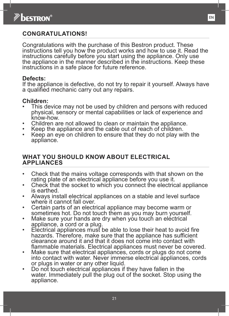 Congratulations with the purchase of this Bestron product. These instructions tell you how the product works and how to use it. Read the instructions carefully before you start using the appliance. Only use the appliance in the manner described in the instructions. Keep these instructions in a safe place for future reference. Defects: If the appliance is defective, do not try to repair it yourself. Always have a qualified mechanic carry out any repairs. Children: • This device may not be used by children and persons with reduced physical, sensory or mental capabilities or lack of experience and know-how. • Children are not allowed to clean or maintain the appliance. • Keep the appliance and the cable out of reach of children. • Keep an eye on children to ensure that they do not play with the appliance. WHAT YOU SHOULD KNOW ABOUT ELECTRICAL APPLIANCES • • • • • • • •