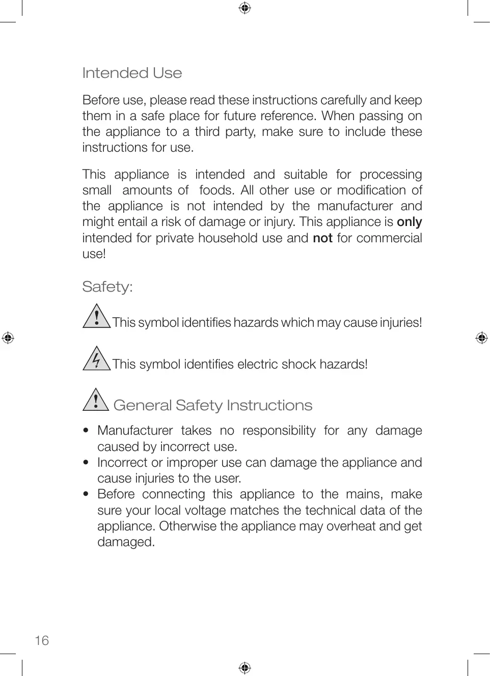 Intended Use Before use, please read these instructions carefully and keep them in a safe place for future reference. When passing on the appliance to a third party, make sure to include these instructions for use. This appliance is intended and suitable for processing small amounts of foods. All other use or modification of the appliance is not intended by the manufacturer and might entail a risk of damage or injury. This appliance is only intended for private household use and not for commercial use! Safety: This symbol identifies hazards which may cause injuries! This symbol identifies electric shock hazards! General Safety Instructions