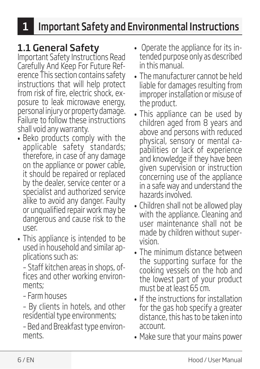 The manufacturer cannot be held liable for damages resulting from improper installation or misuse of the product. This appliance can be used by children aged from 8 years and above and persons with reduced physical, sensory or mental capabilities or lack of experience and knowledge if they have been given supervision or instruction concerning use of the appliance in a safe way and understand the hazards involved. Children shall not be allowed play with the appliance. Cleaning and user maintenance shall not be made by children without supervision. The minimum distance between the supporting surface for the cooking vessels on the hob and the lowest part of your product must be at least 65 cm. If the instructions for installation for the gas hob specify a greater distance, this has to be taken into account. Make sure that your mains power Hood / User Manual