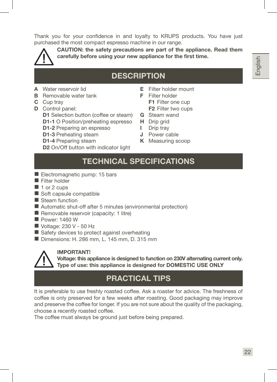 Thank you for your confidence in and loyalty to KRUPS products. You have just purchased the most compact espresso machine in our range. CAUTION: the safety precautions are part of the appliance. Read them carefully before using your new appliance for the first time.