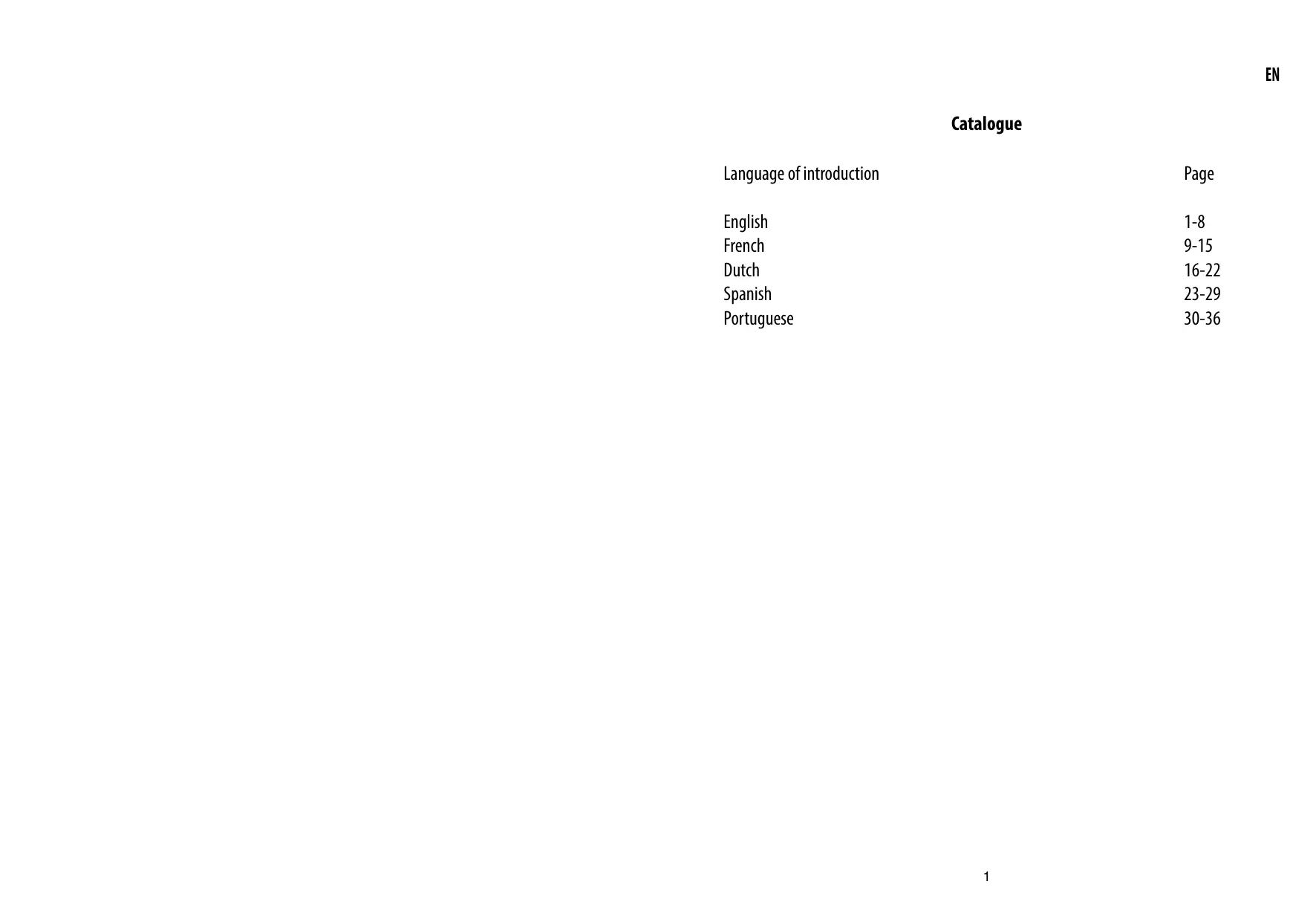 Catalogue Language of introduction Page English French Dutch Spanish Portuguese 1-8 9-15 16-22 23-29 30-36