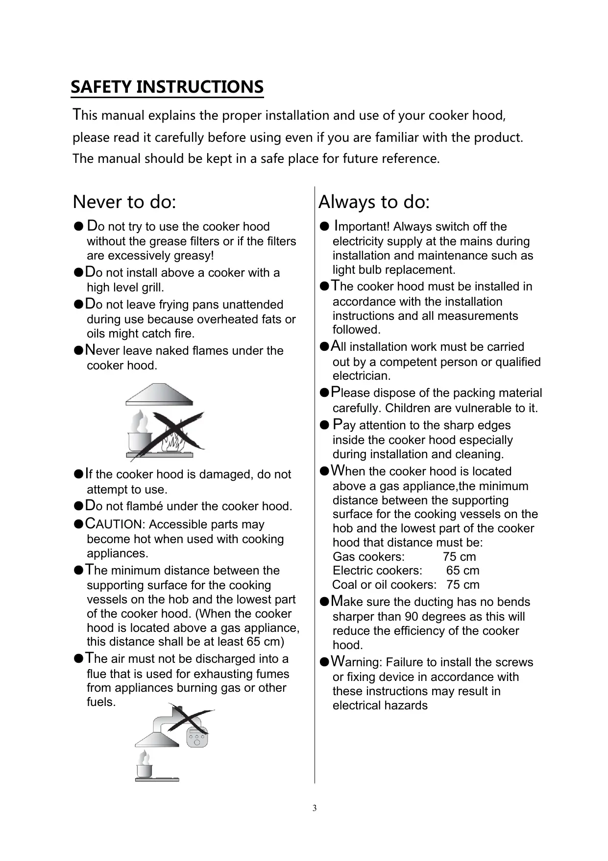 SAFETY INSTRUCTIONS This manual explains the proper installation and use of your cooker hood, please read it carefully before using even if you are familiar with the product. The manual should be kept in a safe place for future reference. Never to do: Always to do: ● Do not try to use the cooker hood without the grease filters or if the filters are excessively greasy! ●Do not install above a cooker with a high level grill. ●Do not leave frying pans unattended during use because overheated fats or oils might catch fire. ●Never leave naked flames under the cooker hood. ● Important! Always switch off the electricity supply at the mains during installation and maintenance such as light bulb replacement. ●The cooker hood must be installed in accordance with the installation instructions and all measurements followed. ●All installation work must be carried out by a competent person or qualified electrician. ●Please dispose of the packing material carefully. Children are vulnerable to it. ● Pay attention to the sharp edges inside the cooker hood especially during installation and cleaning. ●When the cooker hood is located above a gas appliance,the minimum distance between the supporting surface for the cooking vessels on the hob and the lowest part of the cooker hood that distance must be: Gas cookers: 75 cm Electric cookers: 65 cm Coal or oil cookers: 75 cm ●Make sure the ducting has no bends sharper than 90 degrees as this will reduce the efficiency of the cooker hood. ●Warning: Failure to install the screws or fixing device in accordance with these instructions may result in electrical hazards ●If the cooker hood is damaged, do not attempt to use. ●Do not flambé under the cooker hood. ●CAUTION: Accessible parts may become hot when used with cooking appliances. ●The minimum distance between the supporting surface for the cooking vessels on the hob and the lowest part of the cooker hood. (When the cooker hood is located above a gas appliance, this distance shall be at least 65 cm) ●The air must not be discharged into a flue that is used for exhausting fumes from appliances burning gas or other fuels.