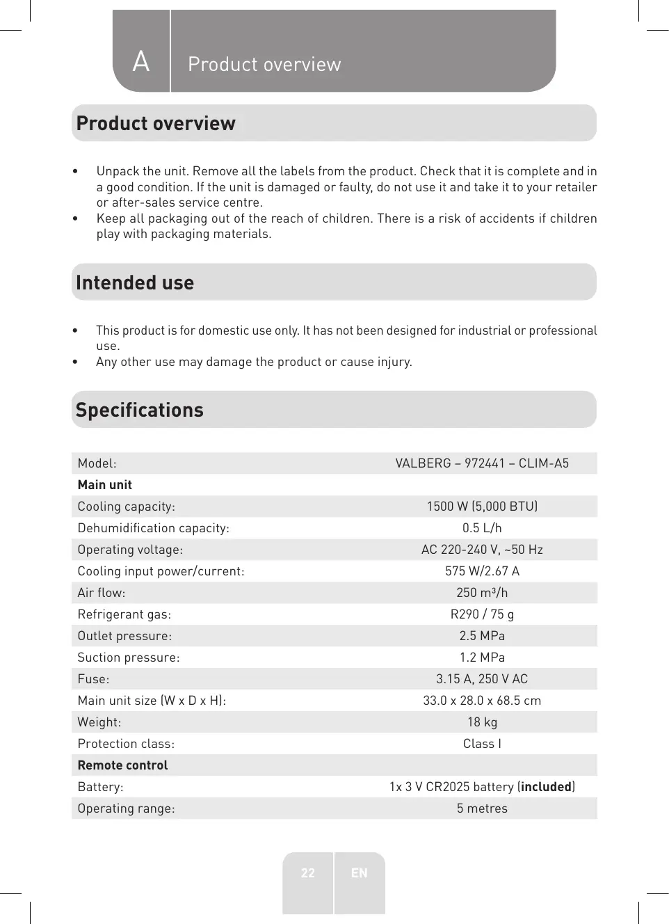 Storage If you do not plan on using the unit for an extended period of time (more than a few weeks), we recommend thoroughly cleaning and drying it. Please store the unit as follows: 1. Unplug the unit and remove both the drain hose and window frame. 2. Drain all the water from the unit. 3. Remove and clean the air inlet filter/cover. Store the air inlet filter/cover in a dry, dust-free place for a few days before repositioning it, in order to allow the evaporator to dry out. When the water has been drained, the unit can also be used in fan mode for about half a day at low speed to thoroughly dry the inside of the unit. Then reposition the air inlet filter/cover, followed by the drain plug. 4. Always store the unit in an upright position. 5. Remove the battery from the remote control. 6. Store the unit and its accessories in a dry, dust-free and wellventilated environment. WARNING! The unit’s evaporator must be dried before putting the unit away, in order to prevent mould from forming or damaging the internal parts.