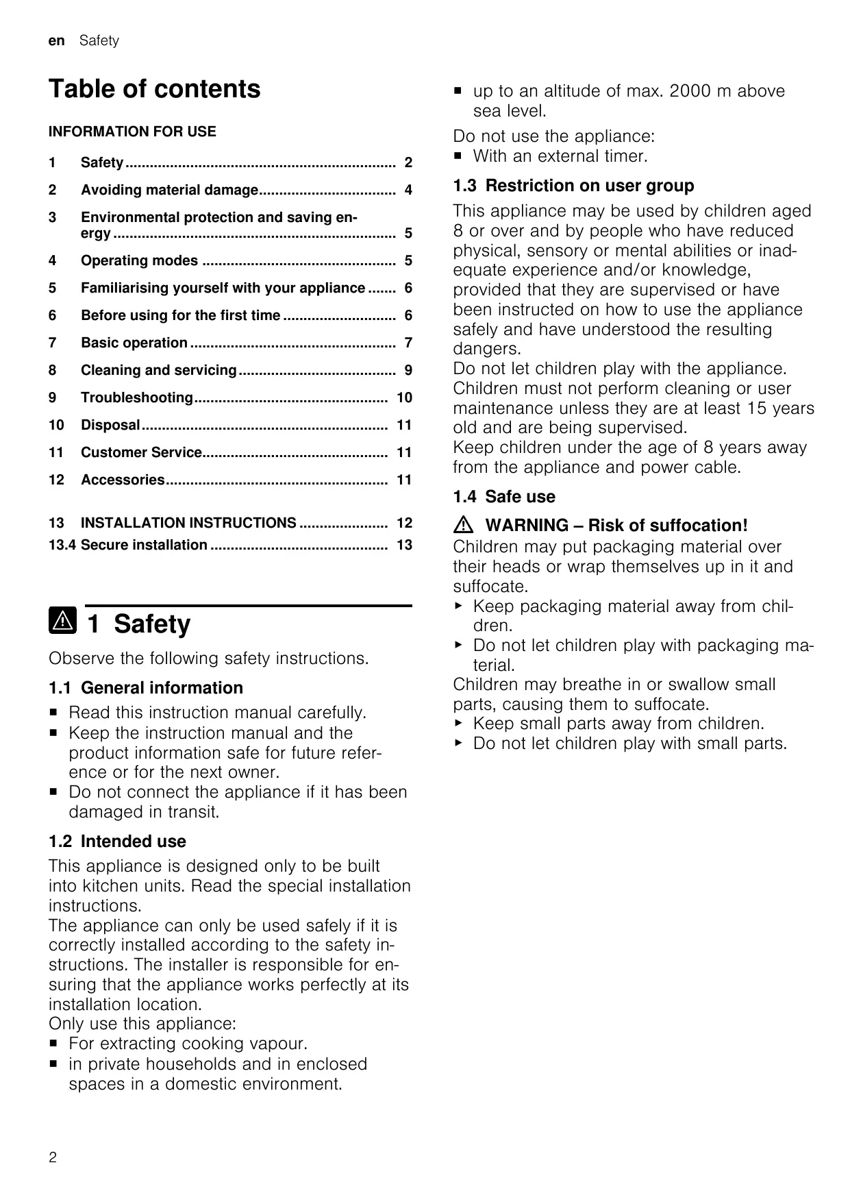 ¡ up to an altitude of max. 2000 m above sea level. Do not use the appliance: ¡ With an external timer. 1.3 Restriction on user group This appliance may be used by children aged 8 or over and by people who have reduced physical, sensory or mental abilities or inadequate experience and/or knowledge, provided that they are supervised or have been instructed on how to use the appliance safely and have understood the resulting dangers. Do not let children play with the appliance. Children must not perform cleaning or user maintenance unless they are at least 15 years old and are being supervised. Keep children under the age of 8 years away from the appliance and power cable. 1.4 Safe use WARNING ‒ Risk of suffocation! Children may put packaging material over their heads or wrap themselves up in it and suffocate. ▶ Keep packaging material away from children. ▶ Do not let children play with packaging material. Children may breathe in or swallow small parts, causing them to suffocate. ▶ Keep small parts away from children. ▶ Do not let children play with small parts.