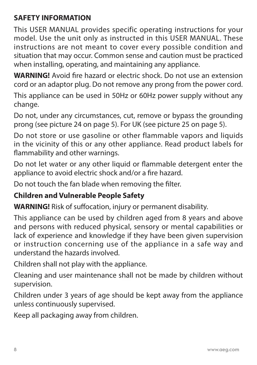 www.aeg.com SAFETY INFORMATION This USER MANUAL provides specific operating instructions for your model. Use the unit only as instructed in this USER MANUAL. These instructions are not meant to cover every possible condition and situation that may occur. Common sense and caution must be practiced when installing, operating, and maintaining any appliance. WARNING! Avoid fire hazard or electric shock. Do not use an extension cord or an adaptor plug. Do not remove any prong from the power cord. This appliance can be used in 50Hz or 60Hz power supply without any change. Do not, under any circumstances, cut, remove or bypass the grounding prong (see picture 24 on page 5). For UK (see picture 25 on page 5). Do not store or use gasoline or other flammable vapors and liquids in the vicinity of this or any other appliance. Read product labels for flammability and other warnings. Do not let water or any other liquid or flammable detergent enter the appliance to avoid electric shock and/or a fire hazard. Do not touch the fan blade when removing the filter. Children and Vulnerable People Safety WARNING! Risk of suffocation, injury or permanent disability. This appliance can be used by children aged from 8 years and above and persons with reduced physical, sensory or mental capabilities or lack of experience and knowledge if they have been given supervision or instruction concerning use of the appliance in a safe way and understand the hazards involved. Children shall not play with the appliance. Cleaning and user maintenance shall not be made by children without supervision. Children under 3 years of age should be kept away from the appliance unless continuously supervised. Keep all packaging away from children.
