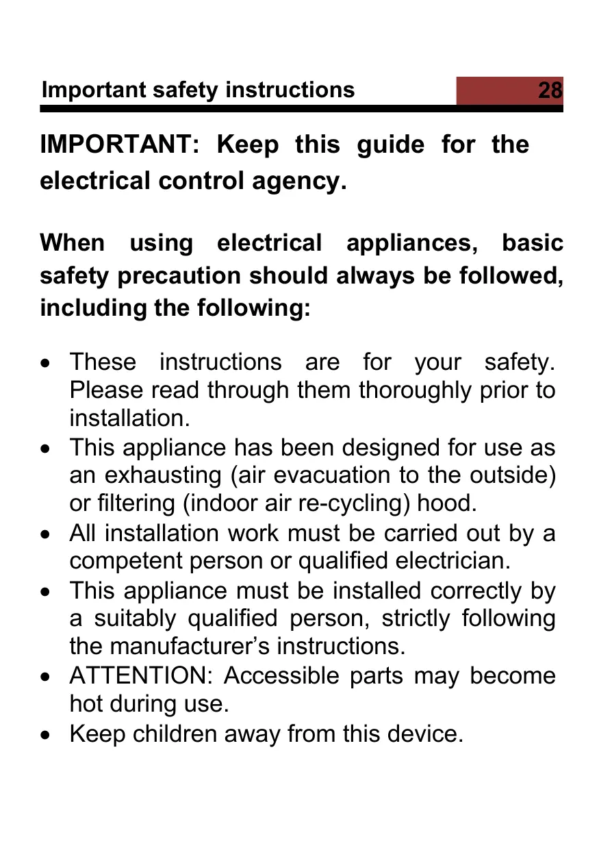 IMPORTANT: Keep this guide for the electrical control agency. When using electrical appliances, basic safety precaution should always be followed, including the following: These instructions are for your safety. Please read through them thoroughly prior to installation. This appliance has been designed for use as an exhausting (air evacuation to the outside) or filtering (indoor air re-cycling) hood. All installation work must be carried out by a competent person or qualified electrician. This appliance must be installed correctly by a suitably qualified person, strictly following the manufacturer’s instructions. ATTENTION: Accessible parts may become hot during use. Keep children away from this device.