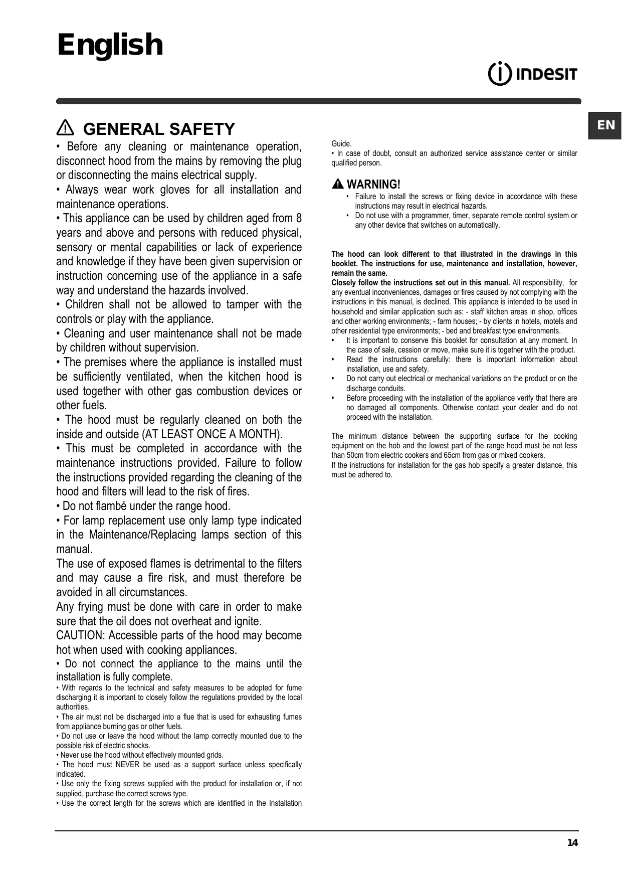 English GENERAL SAFETY • Before any cleaning or maintenance operation, disconnect hood from the mains by removing the plug or disconnecting the mains electrical supply. • Always wear work gloves for all installation and maintenance operations. • This appliance can be used by children aged from 8 years and above and persons with reduced physical, sensory or mental capabilities or lack of experience and knowledge if they have been given supervision or instruction concerning use of the appliance in a safe way and understand the hazards involved. • Children shall not be allowed to tamper with the controls or play with the appliance. • Cleaning and user maintenance shall not be made by children without supervision. • The premises where the appliance is installed must be sufficiently ventilated, when the kitchen hood is used together with other gas combustion devices or other fuels. • The hood must be regularly cleaned on both the inside and outside (AT LEAST ONCE A MONTH). • This must be completed in accordance with the maintenance instructions provided. Failure to follow the instructions provided regarding the cleaning of the hood and filters will lead to the risk of fires. • Do not flambé under the range hood. • For lamp replacement use only lamp type indicated in the Maintenance/Replacing lamps section of this manual. The use of exposed flames is detrimental to the filters and may cause a fire risk, and must therefore be avoided in all circumstances. Any frying must be done with care in order to make sure that the oil does not overheat and ignite. CAUTION: Accessible parts of the hood may become hot when used with cooking appliances.