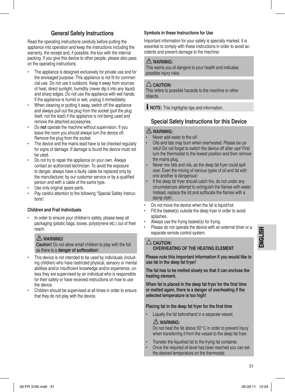 ENGLISH The optimal and safe use of the deep fryer requires that the use instructions be read carefully.