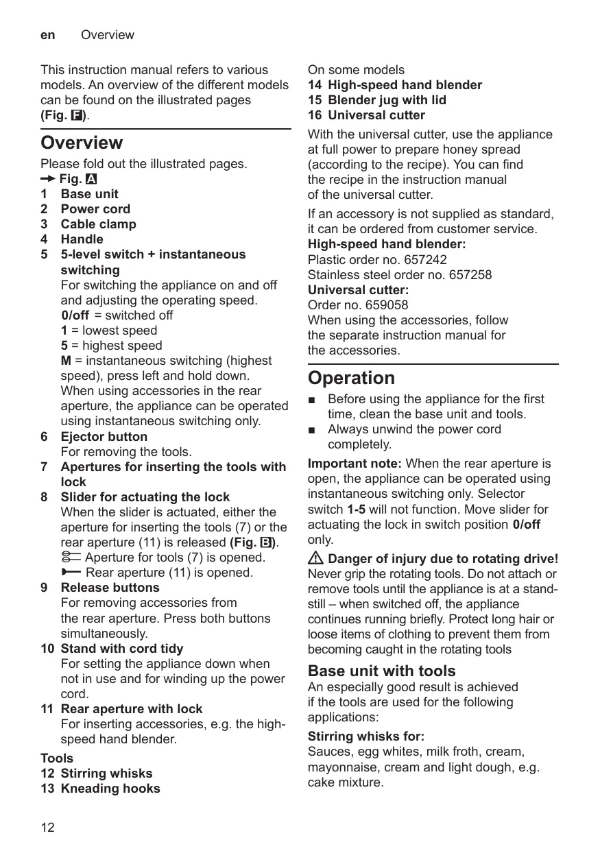X Fig. A 1 Base unit 2 Power cord 3 Cable clamp 4 Handle 5 5-level switch + instantaneous switching For switching the appliance on and off and adjusting the operating speed. P = switched off 1 = lowest speed 5 = highest speed M = instantaneous switching (highest speed), press left and hold down. When using accessories in the rear aperture, the appliance can be operated using instantaneous switching only. 6 Ejector button For removing the tools. 7 Apertures for inserting the tools with lock 8 Slider for actuating the lock When the slider is actuated, either the aperture for inserting the tools (7) or the rear aperture (11) is released (Fig. B). w Aperture for tools (7) is opened. x Rear aperture (11) is opened. 9 Release buttons For removing accessories from the rear aperture. Press both buttons simultaneously. 10 Stand with cord tidy For setting the appliance down when not in use and for winding up the power cord. 11 Rear aperture with lock For inserting accessories, e.g. the highspeed hand blender. Tools 12 Stirring whisks 13 Kneading hooks 12
