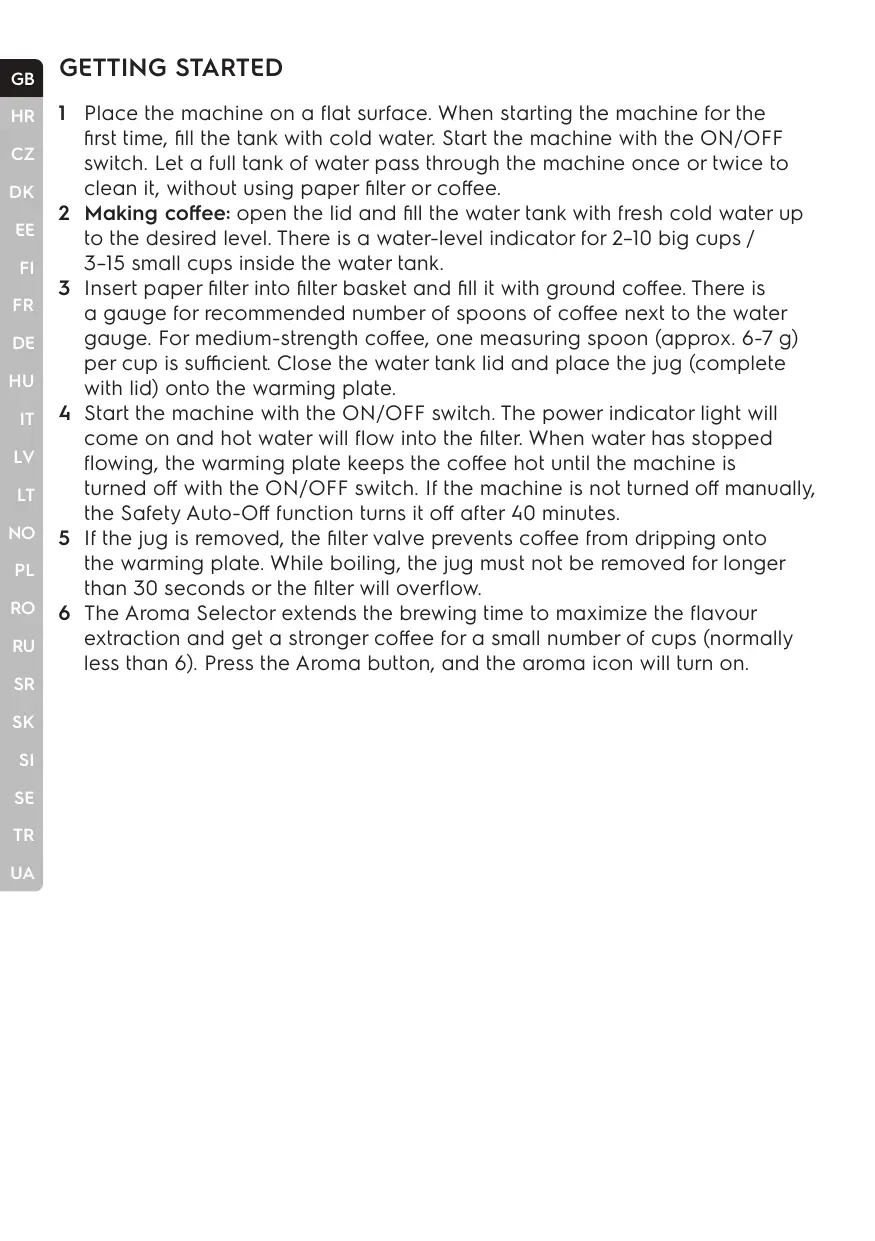 4 Démarrez la machine avec l'interrupteur ON/OFF. Le témoin d'alimentation s'allume et de l'eau chaude s'écoule dans le filtre. Lorsque l'eau a cessé de couler, la plaque chauffante maintient le café chaud jusqu'à ce que la machine s'éteigne avec l'interrupteur ON/OFF. Si la machine n'est pas éteinte manuellement, la fonction d'arrêt automatique de sécurité l'éteint après 40 minutes. 5 Si la cruche est retirée, la valve de filtration empêche le café de s'égoutter sur la plaque chauffante. Pendant l'ébullition, la cruche ne doit pas être retirée pendant plus de 30 secondes sinon le filtre débordera. 6 Le sélecteur d'arôme prolonge le temps de préparation pour maximiser l'extraction de la saveur et obtenir un café plus fort pour un petit nombre de tasses (normalement moins de 6). Appuyez sur le bouton Aroma et l'icône d'arôme s'allumera.